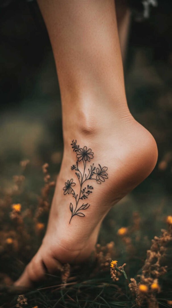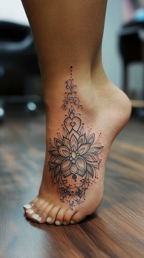 The side of the foot allows vertical or wrapping designs, such as vines climbing from heel to ankle or script trailing along the curve. This spot balances visibility and discretion, though friction from shoe edges can cause faster wear.
