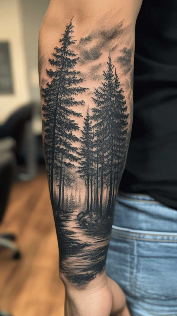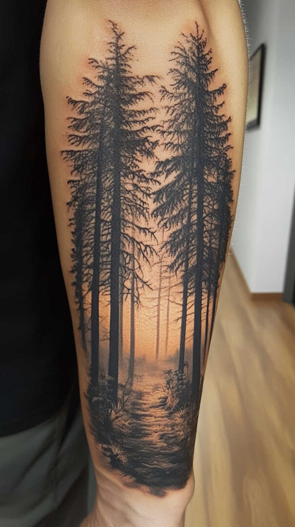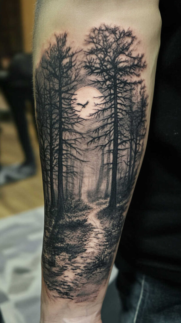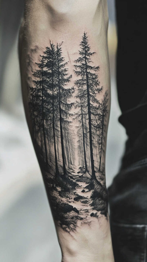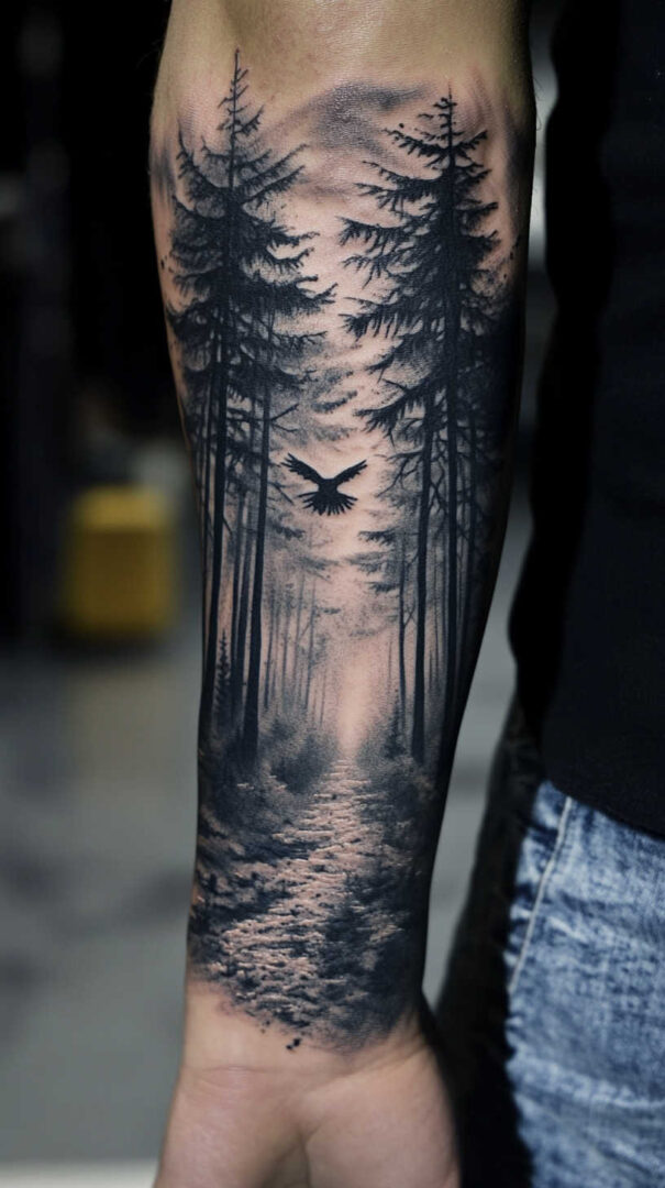 - Forearm / Half Sleeve — Vertical forest path or single ancient tree for graceful length.