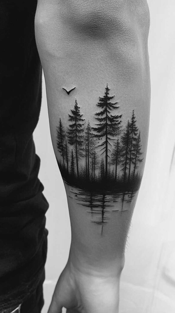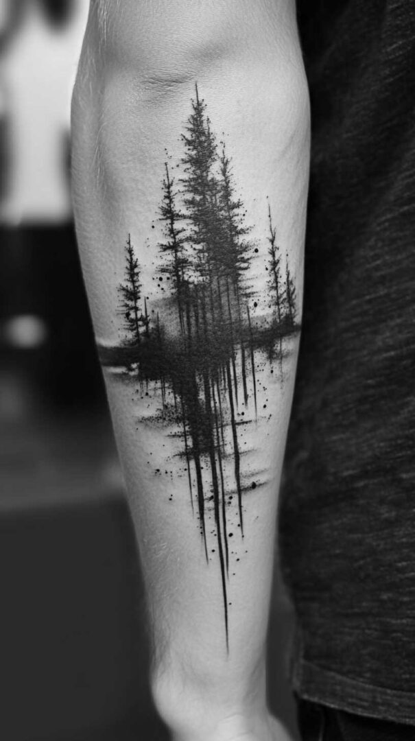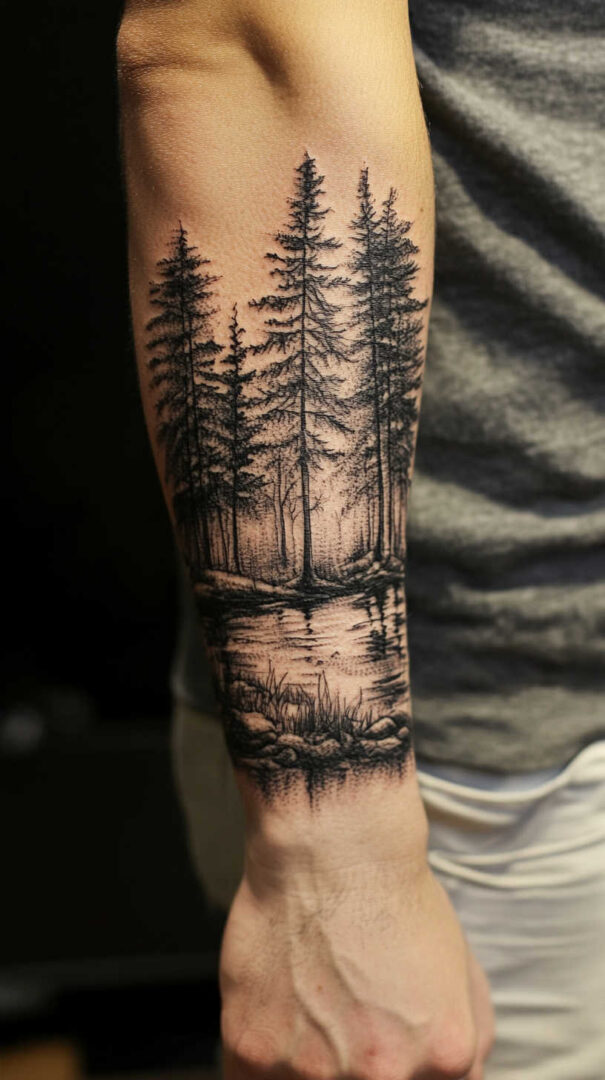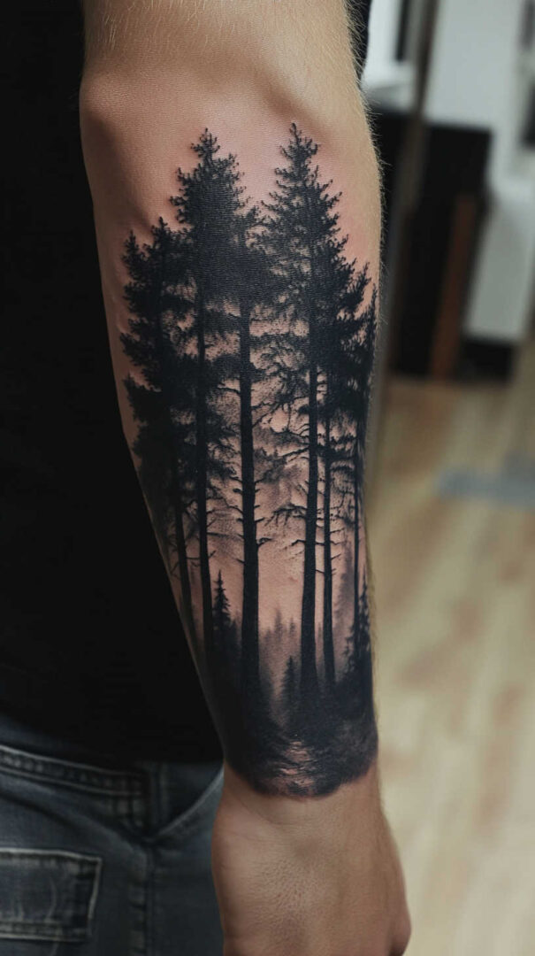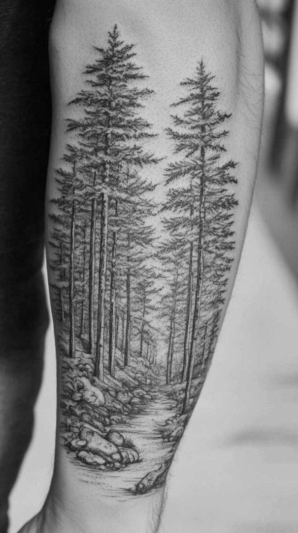 - Forearm / Half Sleeve — Vertical forest path or single ancient tree for graceful length.