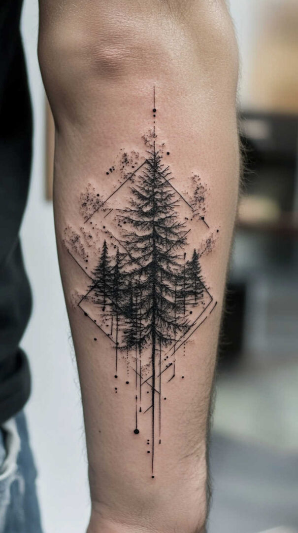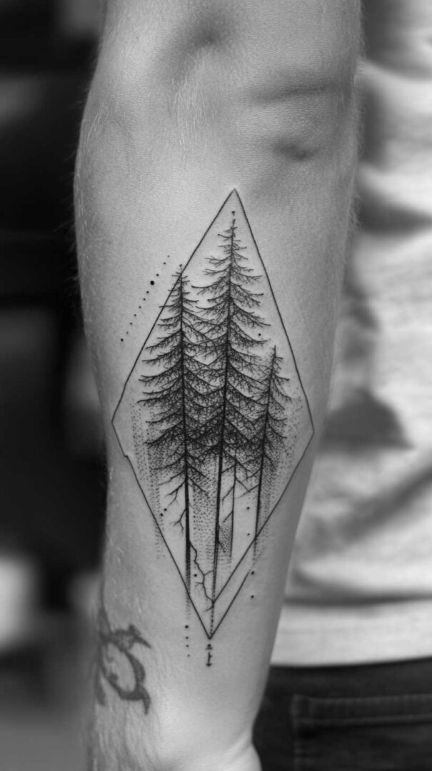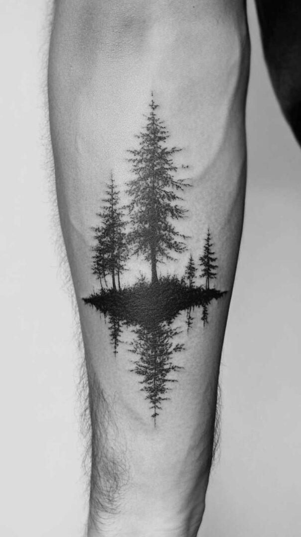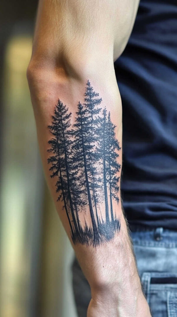 Single or few continuous lines form stylized tree trunks and canopies, often with negative space suggesting depth. Tiny pine tree rows or single ancient tree silhouettes offer subtle yet meaningful tattoos.