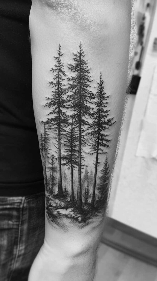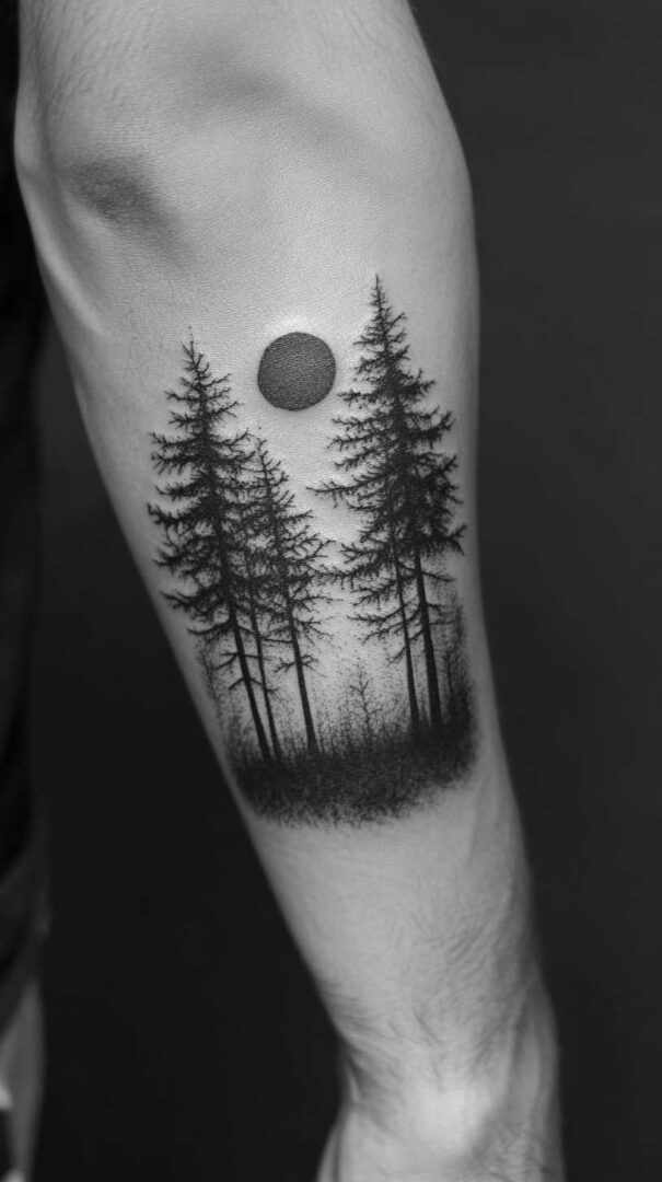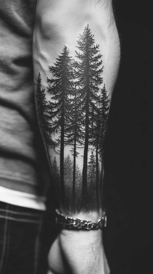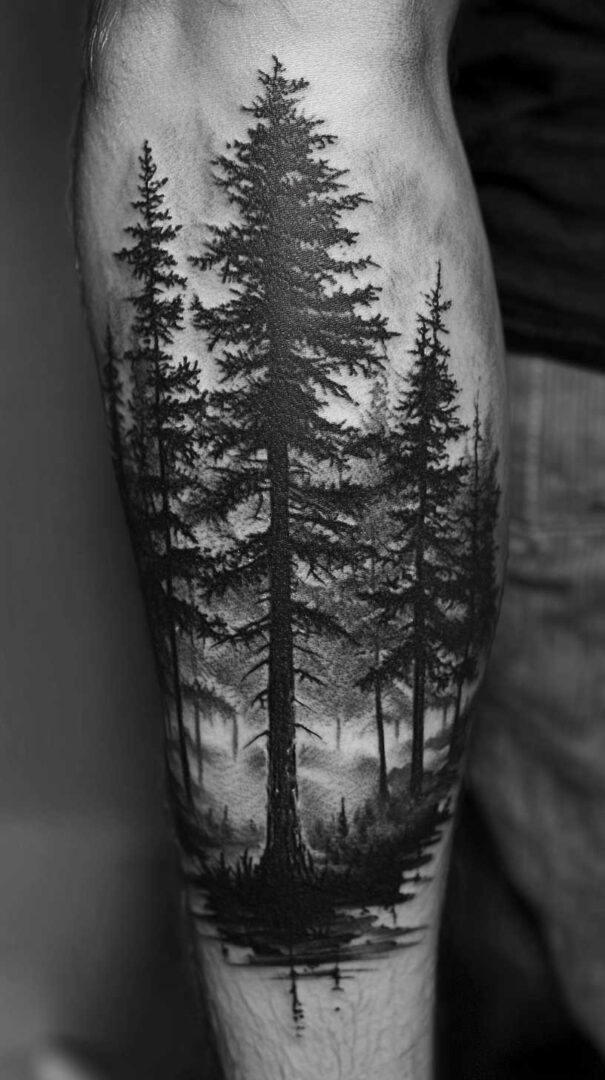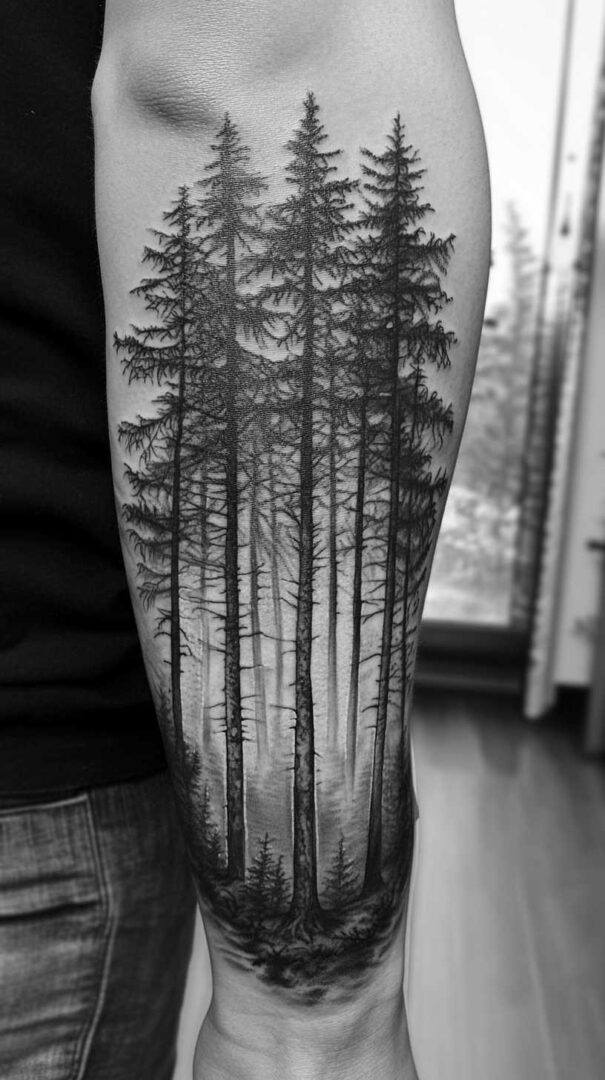 Men often choose forest tattoos to symbolize personal growth, inner strength, resilience through seasons of life, connection to nature, solitude, or the journey through darkness toward light. Designs range from minimalist single trees to expansive forest landscapes. High-resolution renders emphasize organic flow, atmospheric perspective, and how light and shadow bring the woodland scene to life.