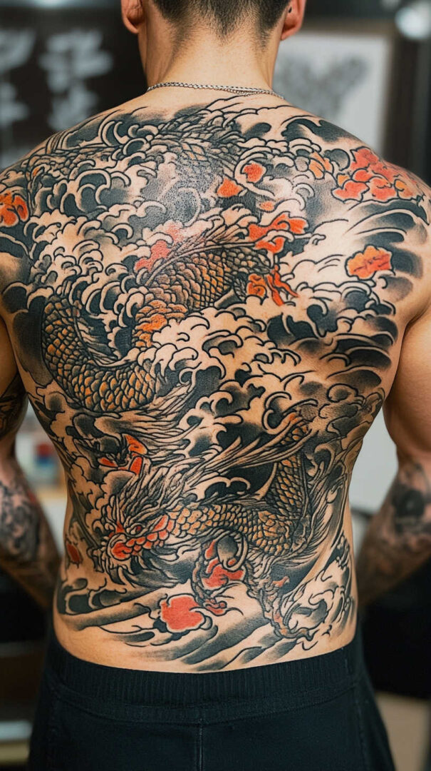 - Dragon or Phoenix — Epic ascending or coiling creatures spanning the entire back, symbolizing power, rebirth, and transformation.