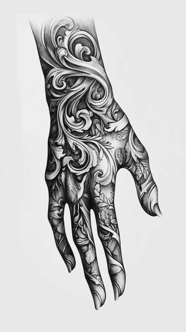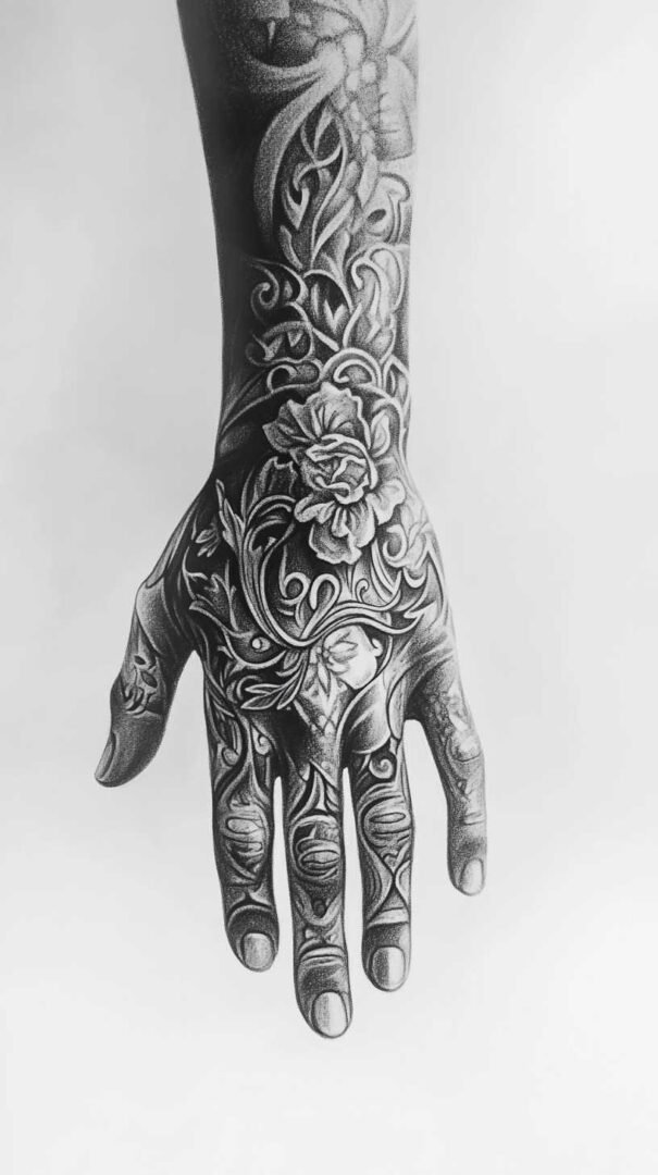 Traditional and Neo-Traditional approaches bring bold outlines and vibrant energy, even when adapted to black and grey. Classic motifs like roses, anchors, or swallows can cover the hand in layered compositions. Neo-traditional versions amplify details with exaggerated features and dynamic shading for a modern twist.