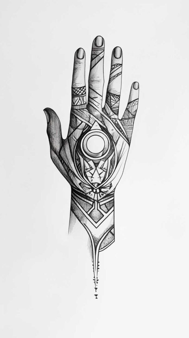 Geometric and Sacred Geometry styles emphasize precision and symmetry. These designs incorporate shapes like hexagons, triangles, circles, and interlocking patterns that flow across the hand’s contours. A full hand geometric sketch could center a mandala on the back of the hand, with radiating lines extending to fingertips and palm motifs mirroring the design for balance. Sacred geometry often draws from ancient principles, creating optical illusions of depth and movement that look incredible in high-definition sketches.