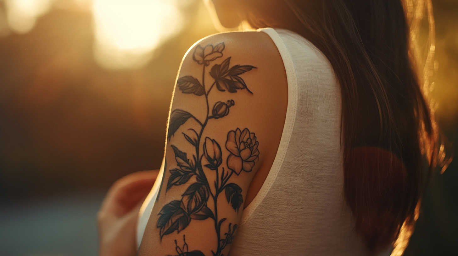 Imagine a cascading arrangement of peonies and lotuses flowing from shoulder to forearm, with delicate petals rendered in hyper-realistic shading for 4K-like clarity. Black and gray versions offer sophisticated drama, while vibrant color pieces burst with life.