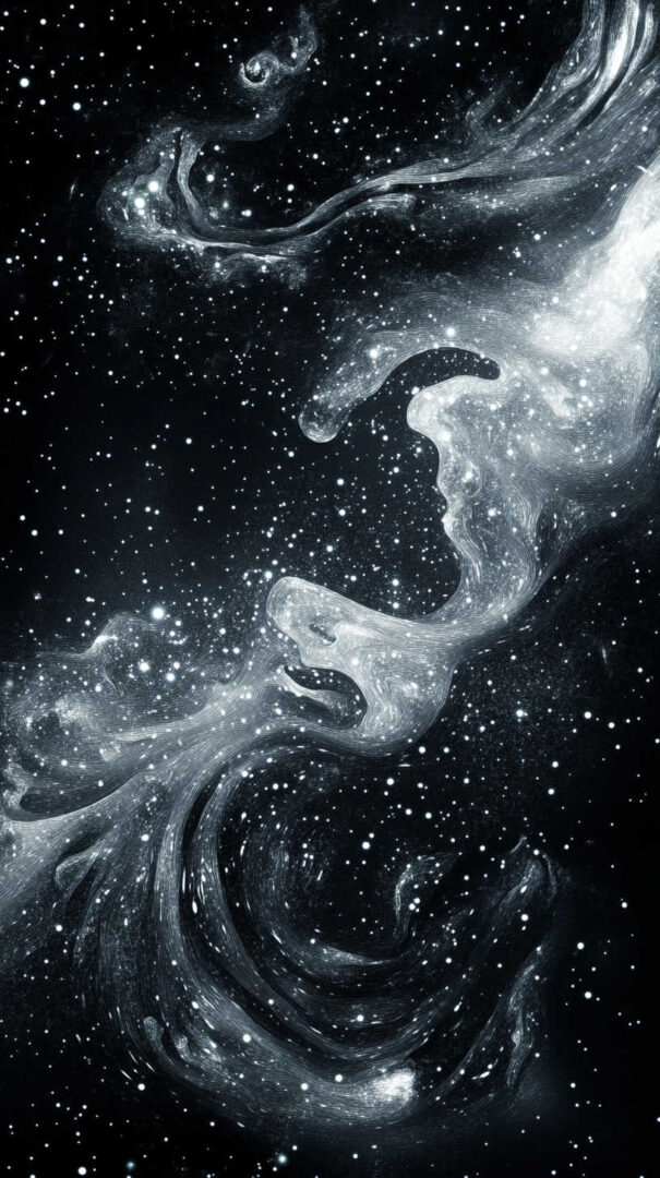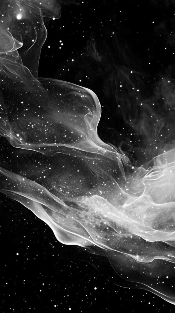 Deep space blacks with vibrant nebulae gradients (purples, blues, pinks, teals) create a luminous, otherworldly effect. Monochrome black-and-grey versions emphasize dramatic contrast and star pinpoint accuracy. Selective gold or silver star highlights add premium celestial sparkle.