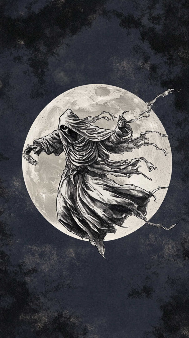 - Ghost & Moon Phases — Crescent or full moon behind for nocturnal mystery.