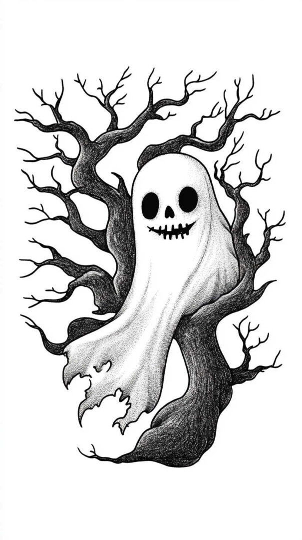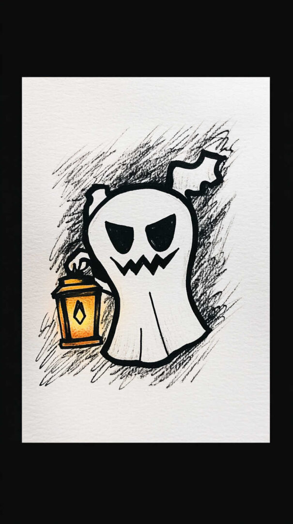 Grinning sheet ghosts with jagged edges, chains, or “boo” banners. Vintage-style apparitions with Victorian clothing or lantern glows. Bold black outlines and limited shading for printable flash appeal.