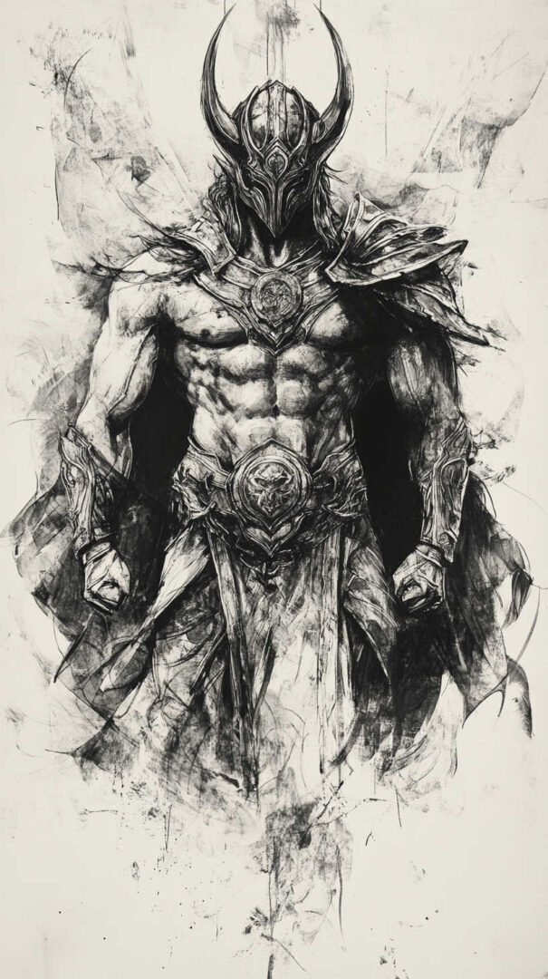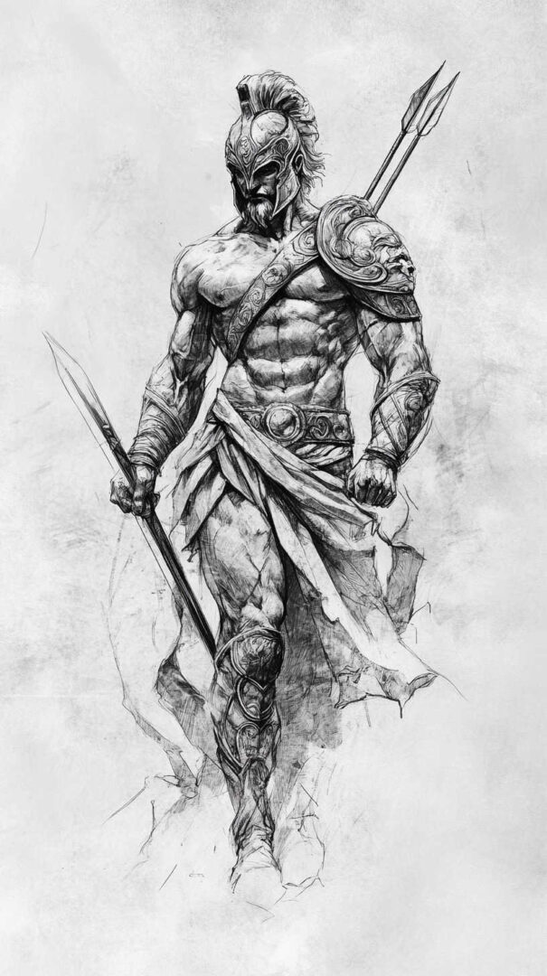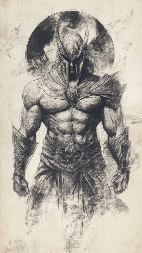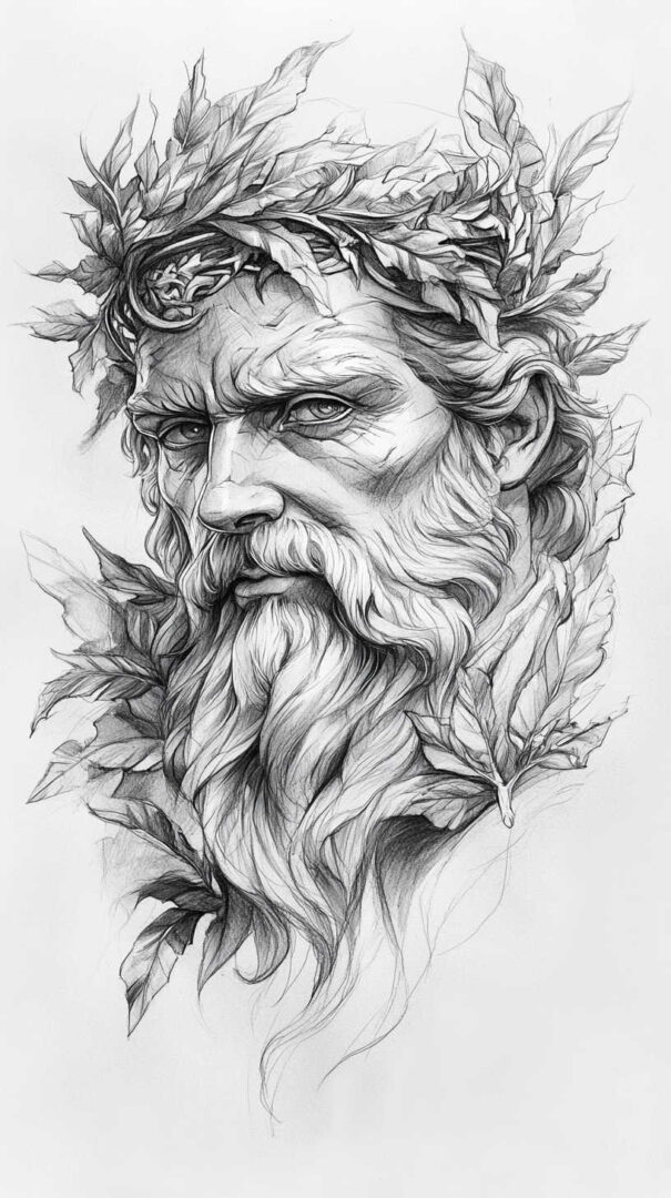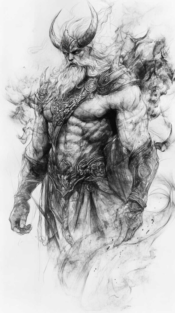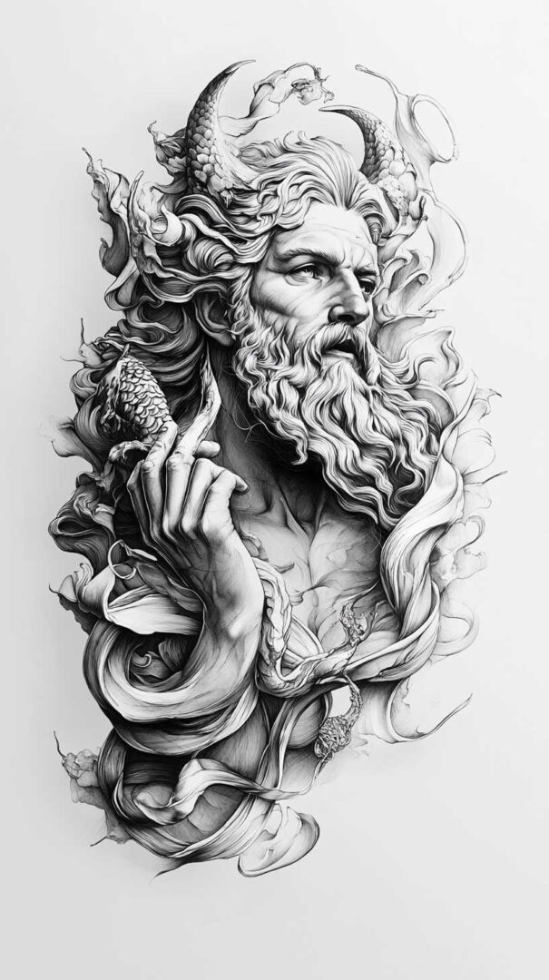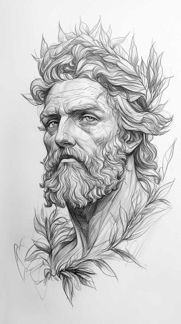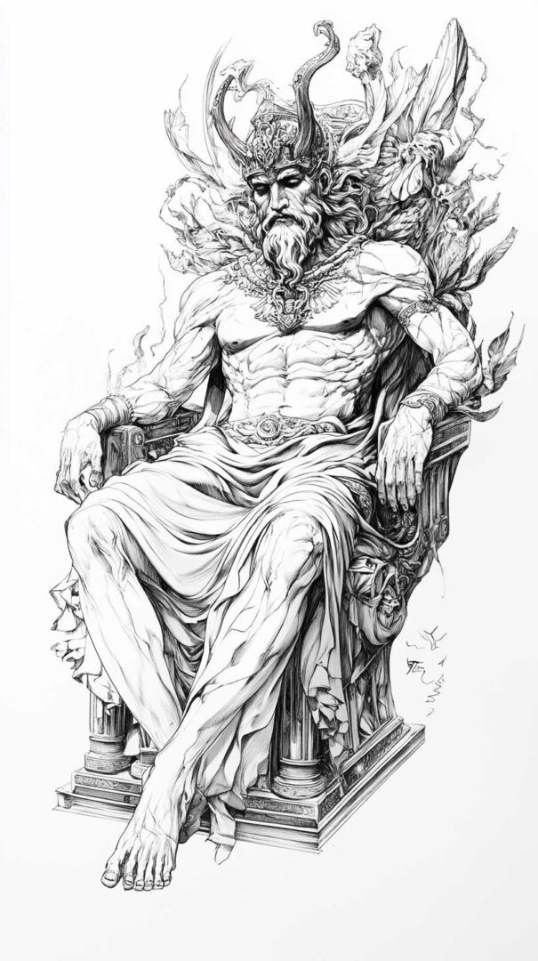HD sketches capture the timeless sculptural quality, dramatic drapery, and symbolic accuracy of the god’s attributes.