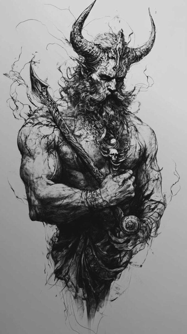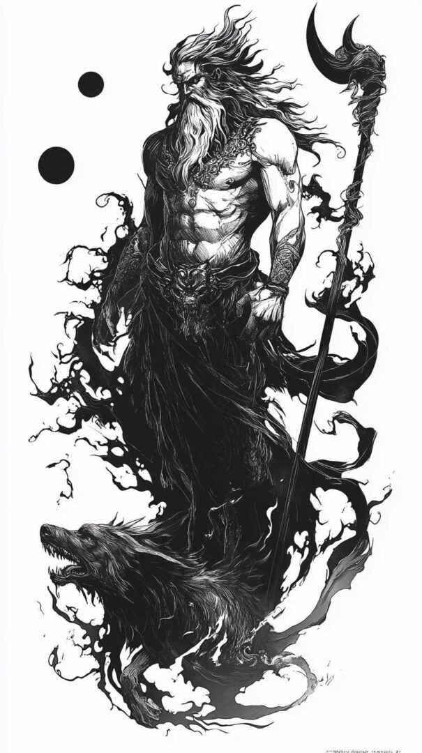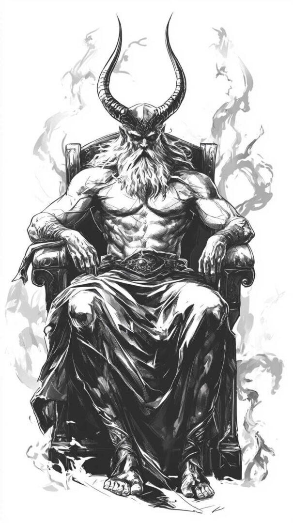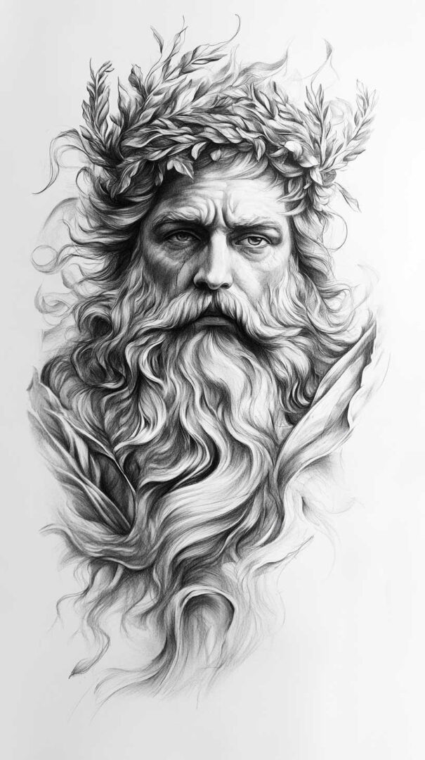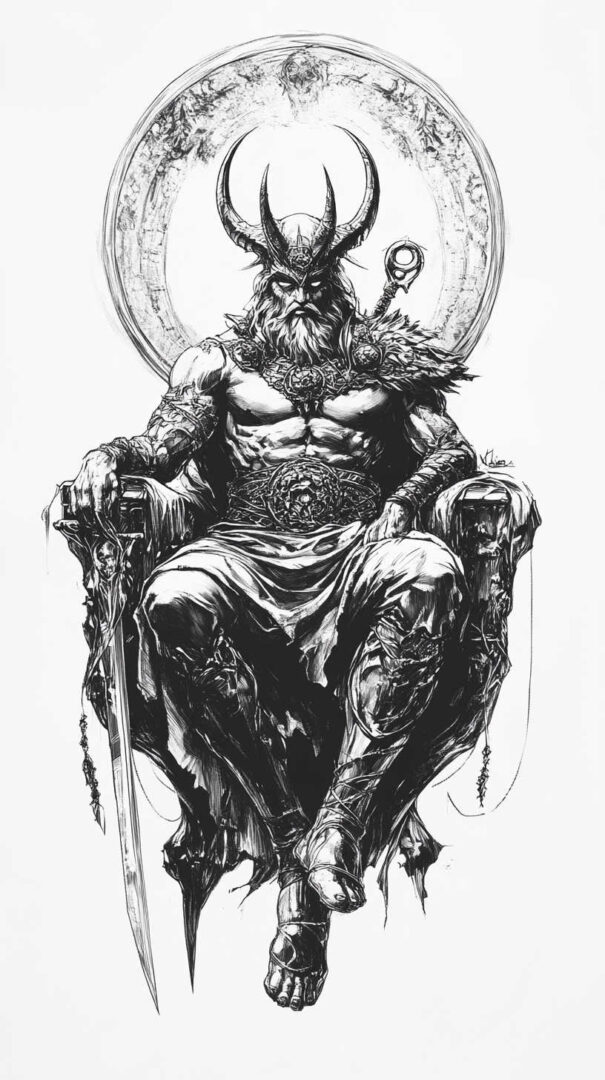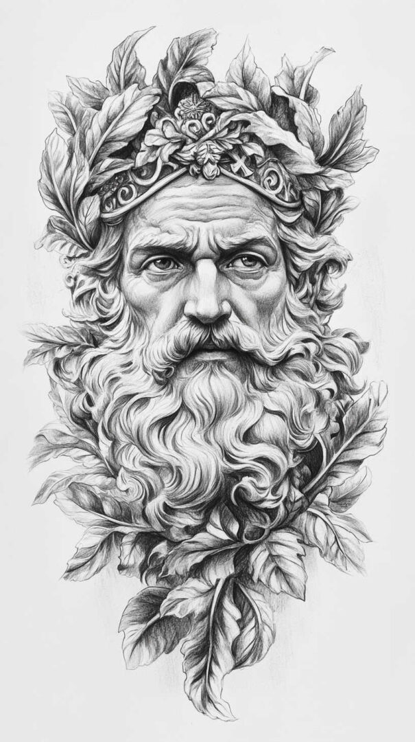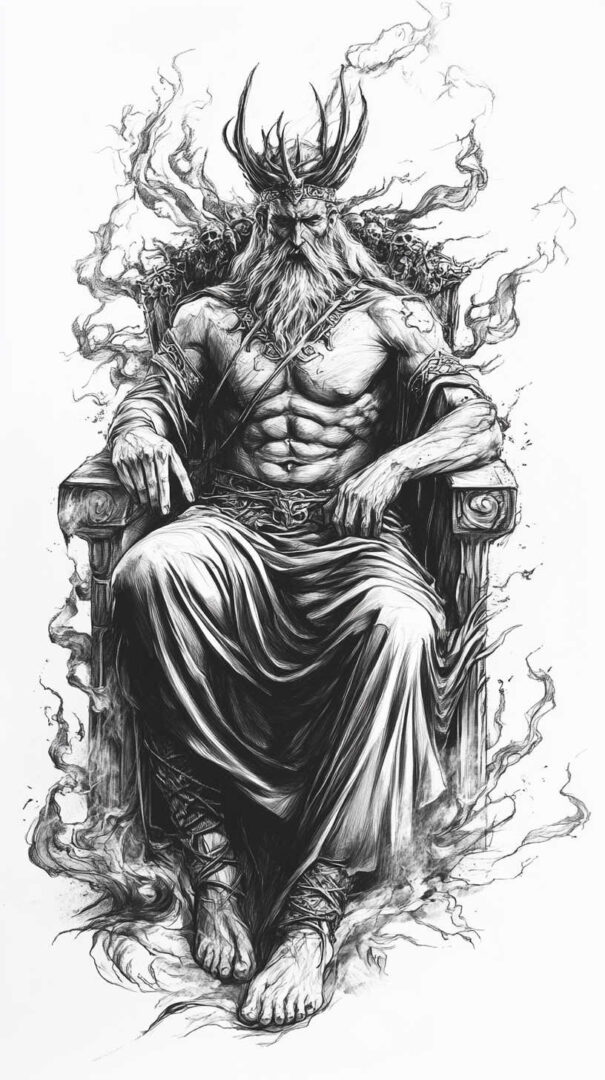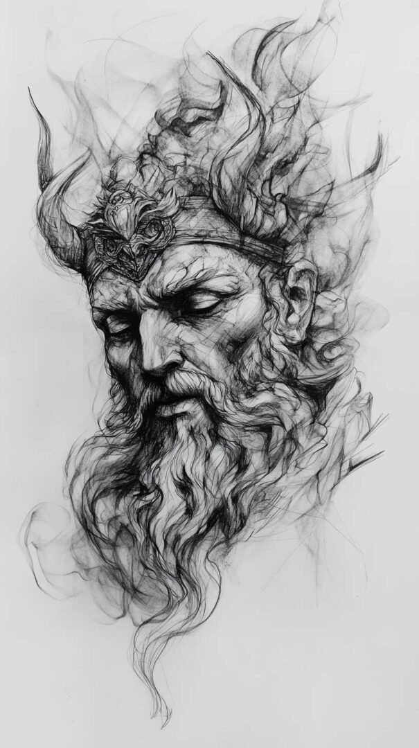Black-and-grey realism uses deep shadows and subtle highlights to create sculptural depth. Selective gold or crimson accents on the crown and eyes add divine menace. HD quality preserves every beard strand, fabric fold, and metallic reflection for a commanding, almost statuesque effect.
