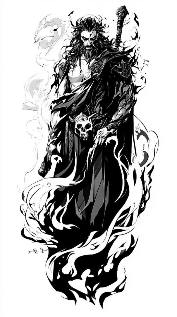 Black-and-grey creates moody, sculptural depth with excellent aging. Selective crimson reds (robes or flames), gold (crown and scepter), or cool blues (shadows) add divine or infernal emphasis. Traditional styles use bold contrasts for graphic power.