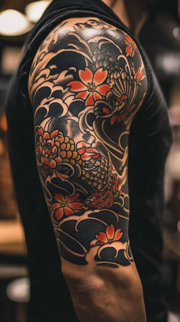 Japanese irezumi influences include koi fish symbolizing perseverance. Waves and cherry blossoms add narrative depth with fluid lines and colors.