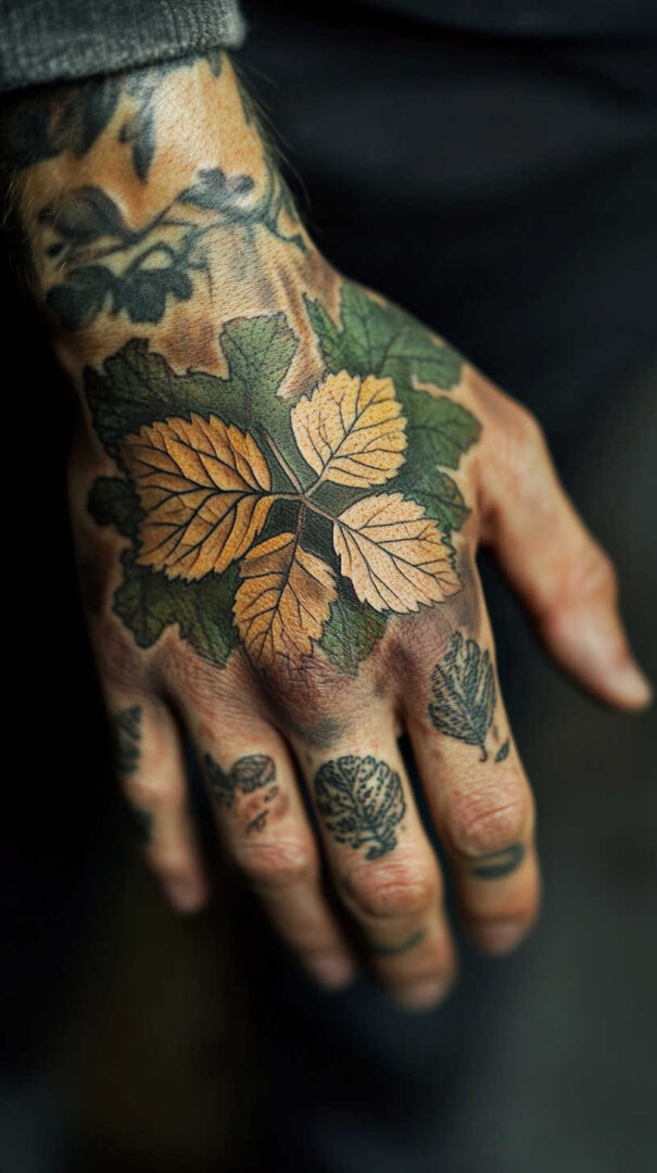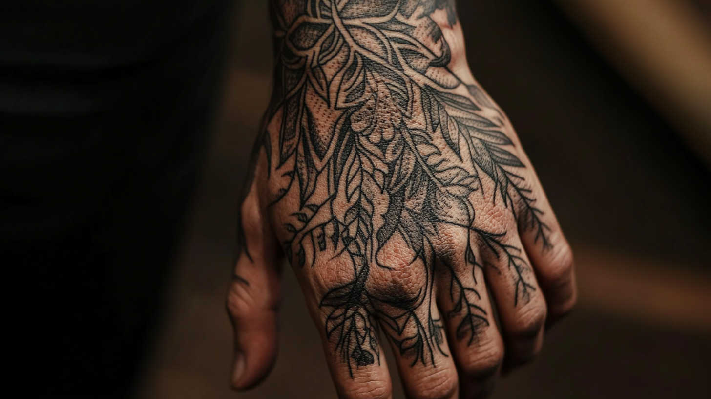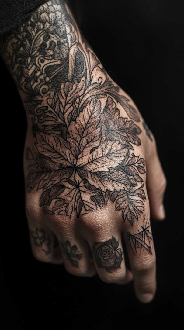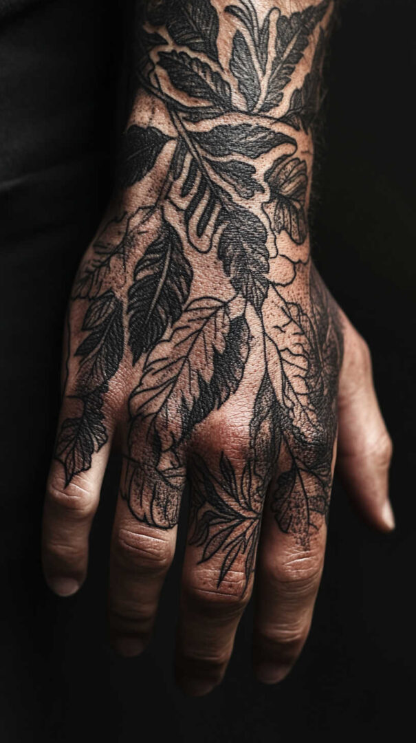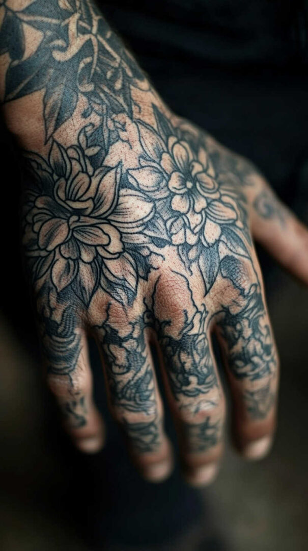 Hand tattoos often extend from sleeves, creating cohesive narratives. Matching motifs unify pieces, like vines trailing from arms to fingers.