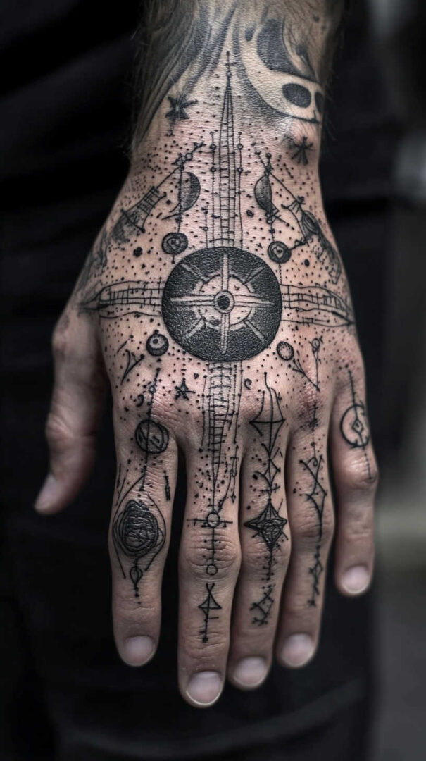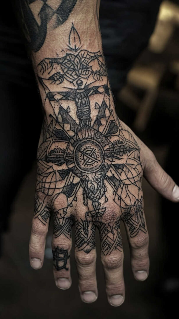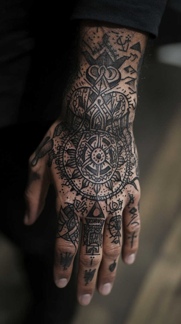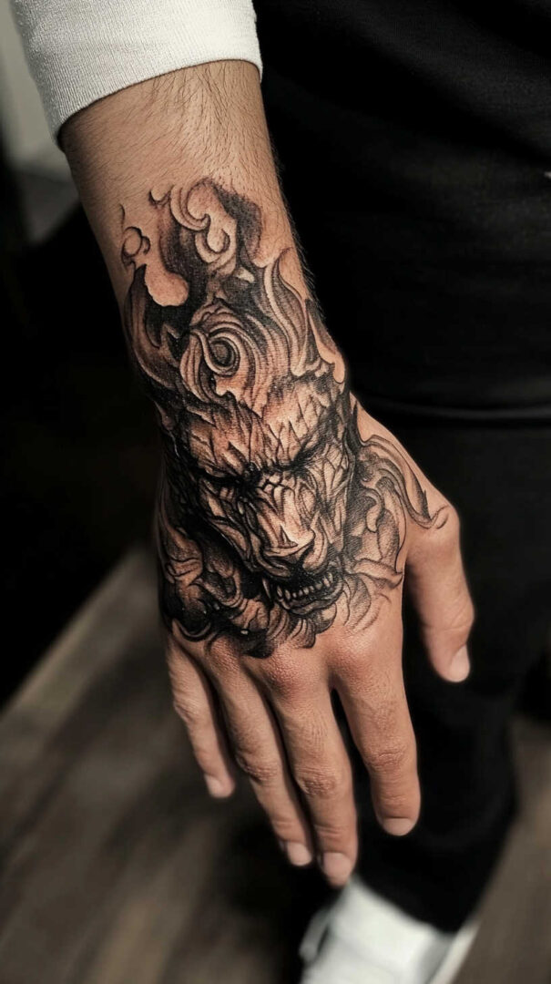 Realistic tattoos push the boundaries of 4K HD, transforming the hand into a gallery of lifelike imagery. Portraits of animals, such as wolves or eagles, capture fur textures and piercing eyes with photographic accuracy. Mechanical elements, like gears and circuits, appeal to tech-savvy men, with metallic sheen achieved through subtle color blending. Nature scenes, including forests or mountains, wrap around the hand, using hyper-realistic shading to depict dew on leaves or mist in valleys. These designs demand skilled artists to handle the hand’s movement-prone skin, ensuring details don’t distort.