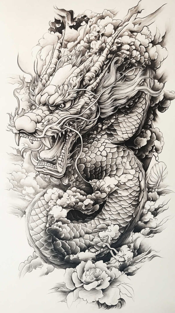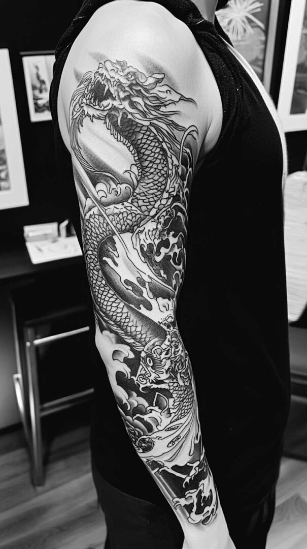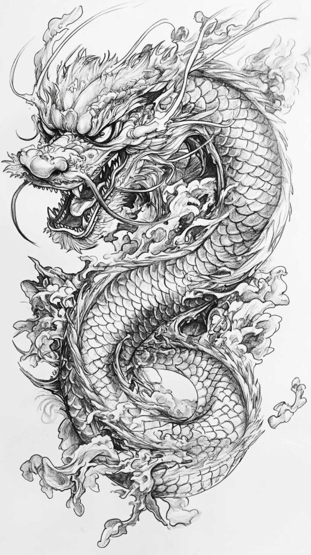 The dragon is the centerpiece of many full sleeves. Sketches show elongated, wingless serpentine bodies coiling gracefully from shoulder to wrist, with three-toed claws, flowing whiskers, antlers, and flaming pearls. Backgrounds include crashing waves, swirling clouds, and wind bars for dynamic movement.