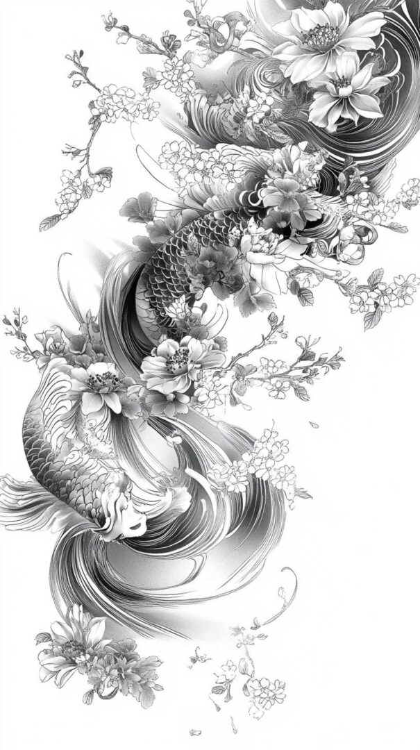 Koi represent perseverance and success. Designs feature large carp swimming upstream through turbulent water, often leaping toward transformation into a dragon. Detailed scales, fin rays, and splashing effects create a sense of constant motion.