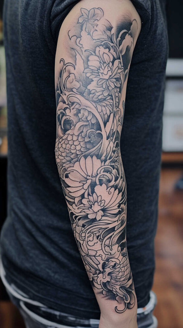 Japanese full sleeve tattoos, known as irezumi, represent one of the most prestigious and artistically ambitious forms of body art for men. A complete sleeve covers the entire arm from shoulder to wrist, creating a continuous, flowing narrative canvas. In 4K HD quality, sketches display breathtaking precision — bold black outlines, intricate scale and wave textures, delicate petal details, masterful negative space, and seamless transitions across the elbow and shoulder — allowing exact visualization of how the design wraps the arm and moves with every flex and rotation.