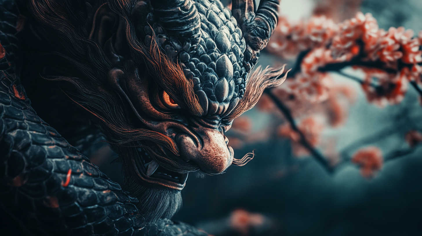 - Dragon (Ryu / 龍) — Benevolent water deity symbolizing wisdom, strength, prosperity. Coils through clouds/waves, grasping flaming pearl.