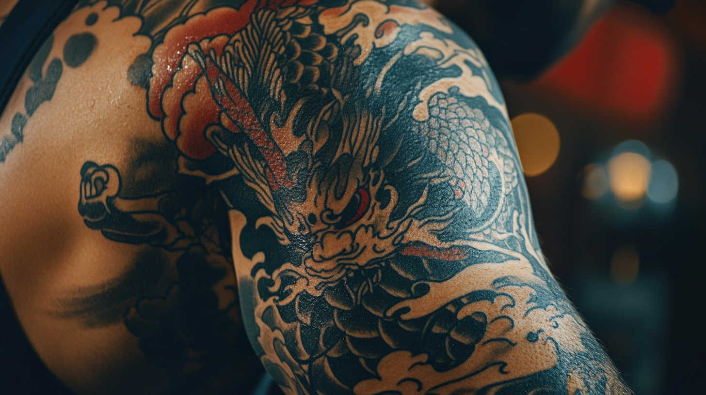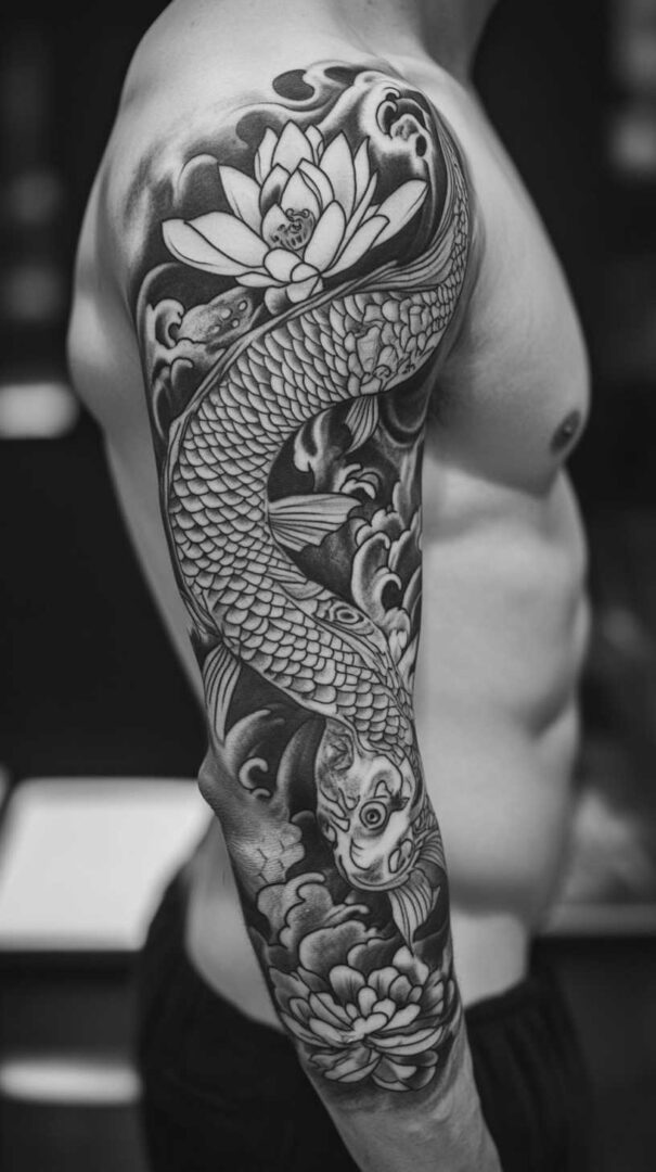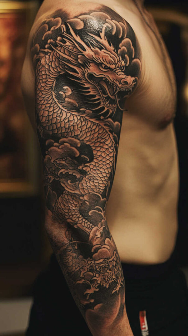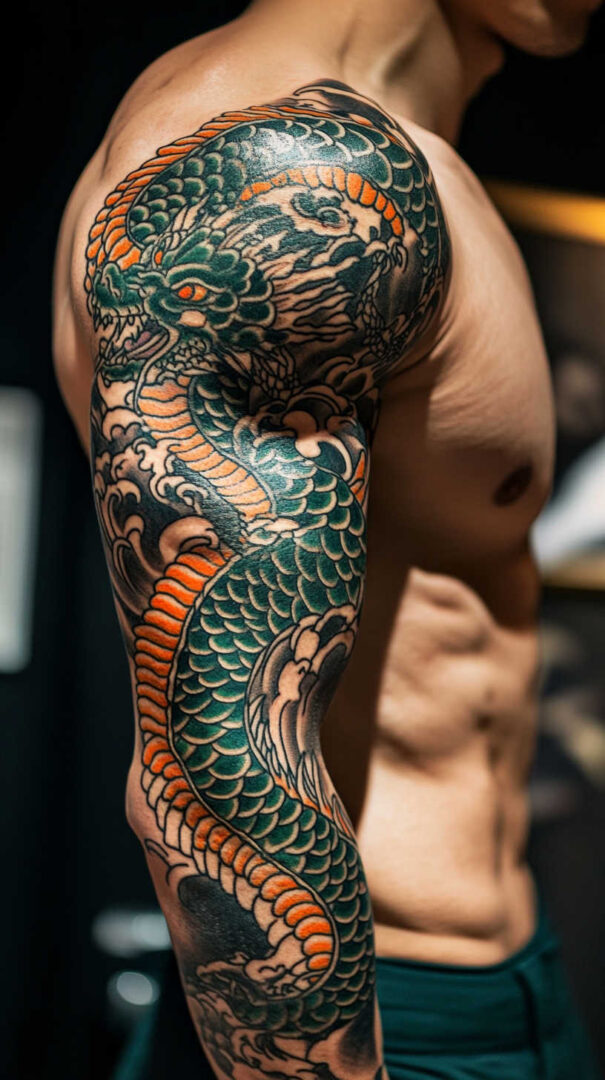 - Full/Half Sleeve — Dragon/koi coiling from shoulder to wrist; head near deltoid for impact.