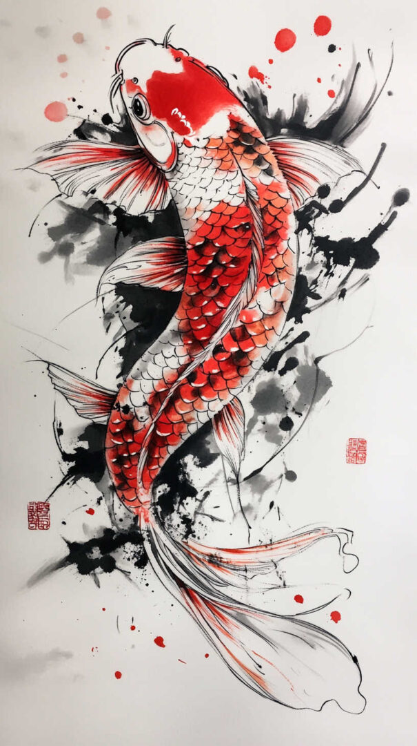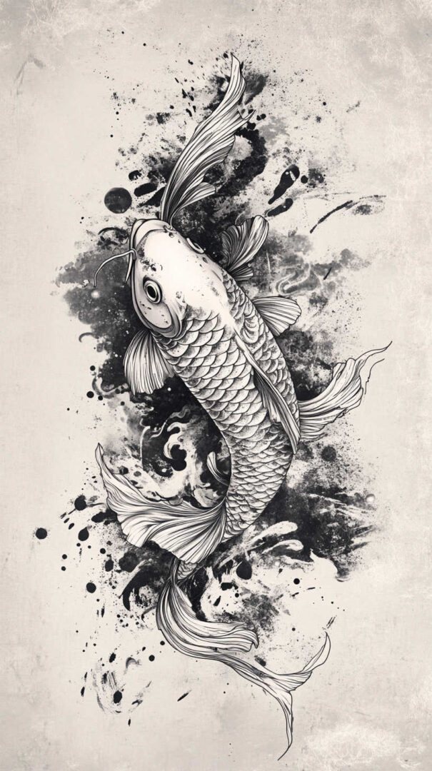 Black-and-grey realism uses soft gradients for depth and dimension, while selective color versions highlight the iconic Kohaku (white with red), Showa (black, red, white), or Asagi (blue-grey) patterns.