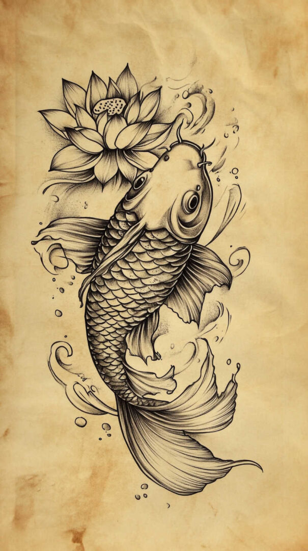 Single continuous lines trace the fish’s silhouette, tail curve, and fins. Tiny koi with delicate whiskers and dot eyes offer subtle yet meaningful tattoos. Fine-line techniques add soft scale hints or water ripples without overcrowding.