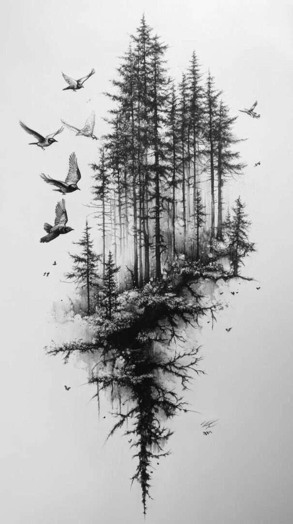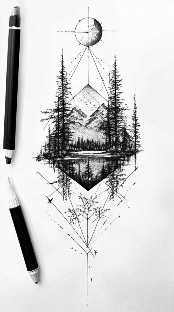 - Forearm / Half Sleeve — Vertical tree or mountain scene for graceful length.