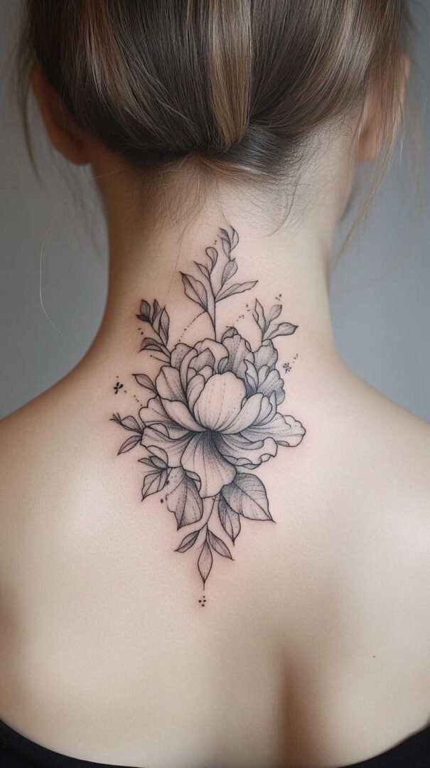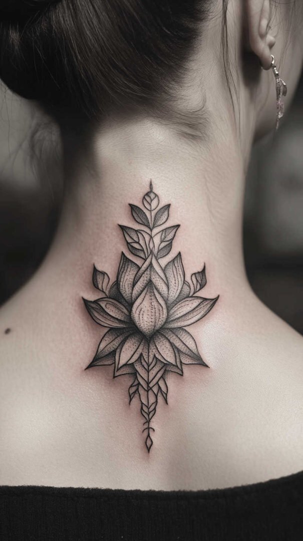 Side neck pieces curve gracefully with the jawline, often featuring vines, feathers, or birds in flight. Nape (back of neck) tattoos act like hidden jewelry, revealed with updos—perfect for floral bouquets or small mandalas.