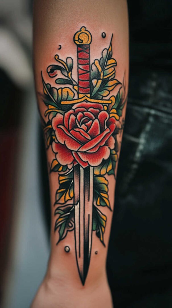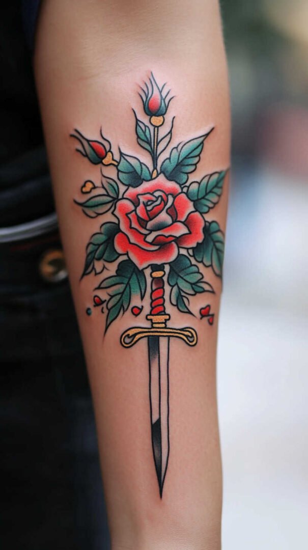 Floral elements are another cornerstone of old school tattoos, and they resonate deeply with feminine aesthetics. Roses, in particular, stand out as a perennial favorite. A single rose or a bouquet can be rendered in 4K HD with petals that exhibit subtle veining and thorns that add an edge of toughness.