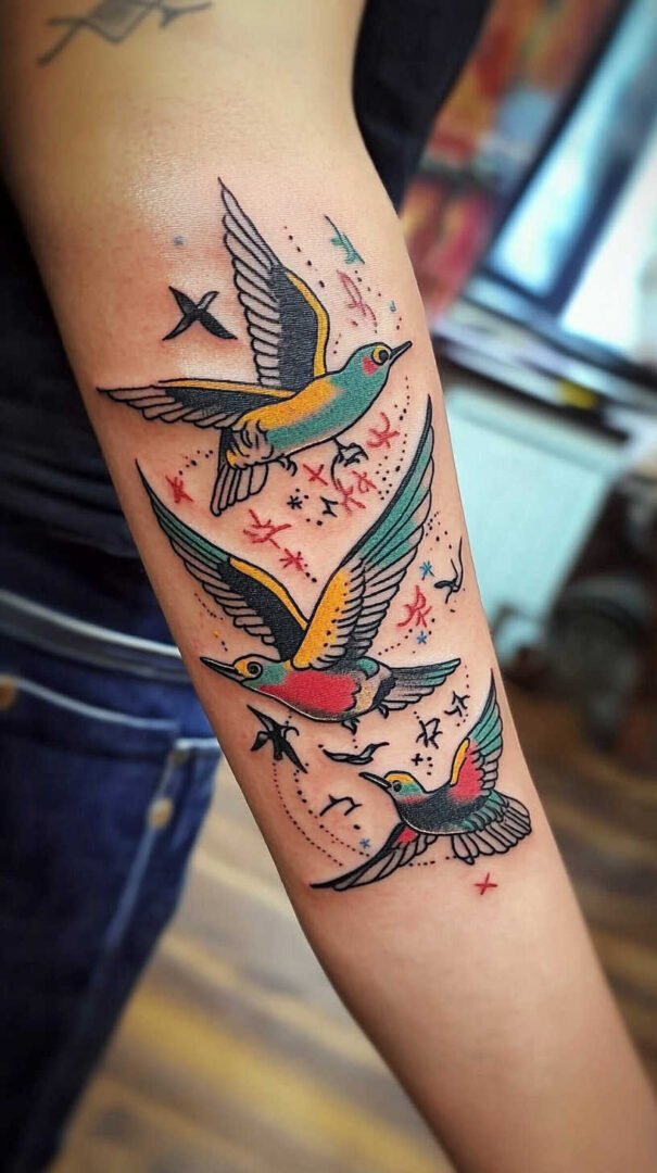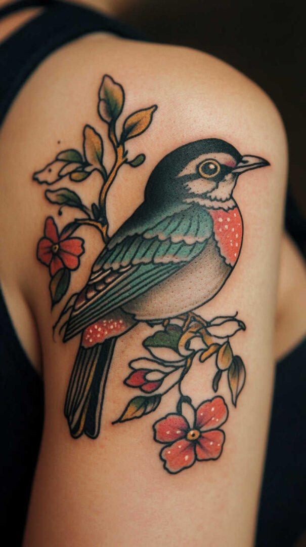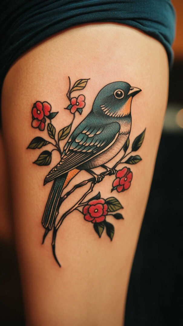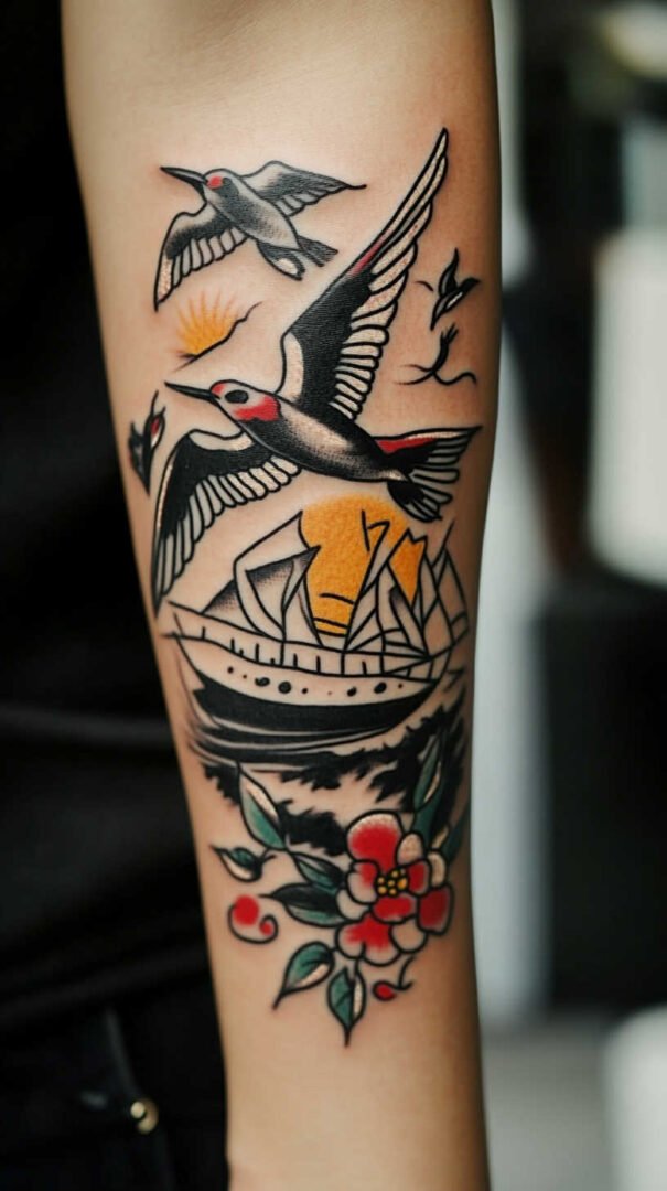 Animal motifs bring a wild, untamed energy to old school tattoos for women. Swallows, often depicted in pairs, symbolize freedom and safe travels, making them ideal for those who cherish independence. In high-definition designs, the feathers can be detailed with fine lines that mimic real plumage, enhancing the sense of motion.