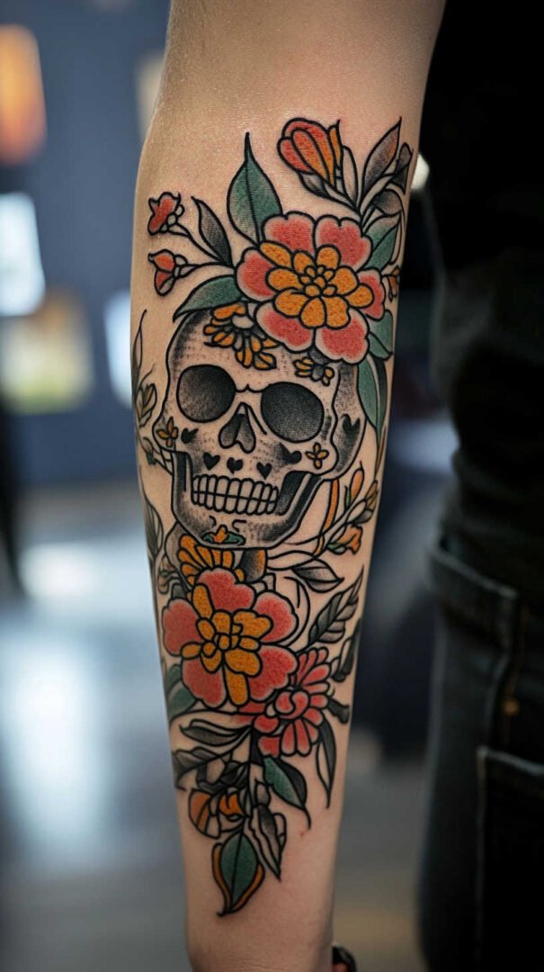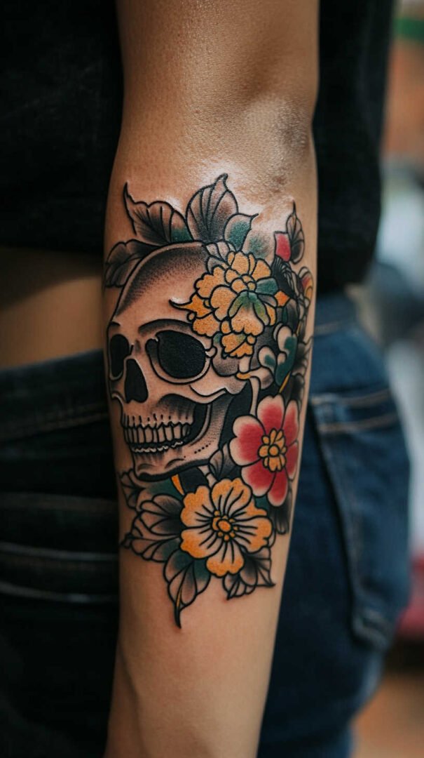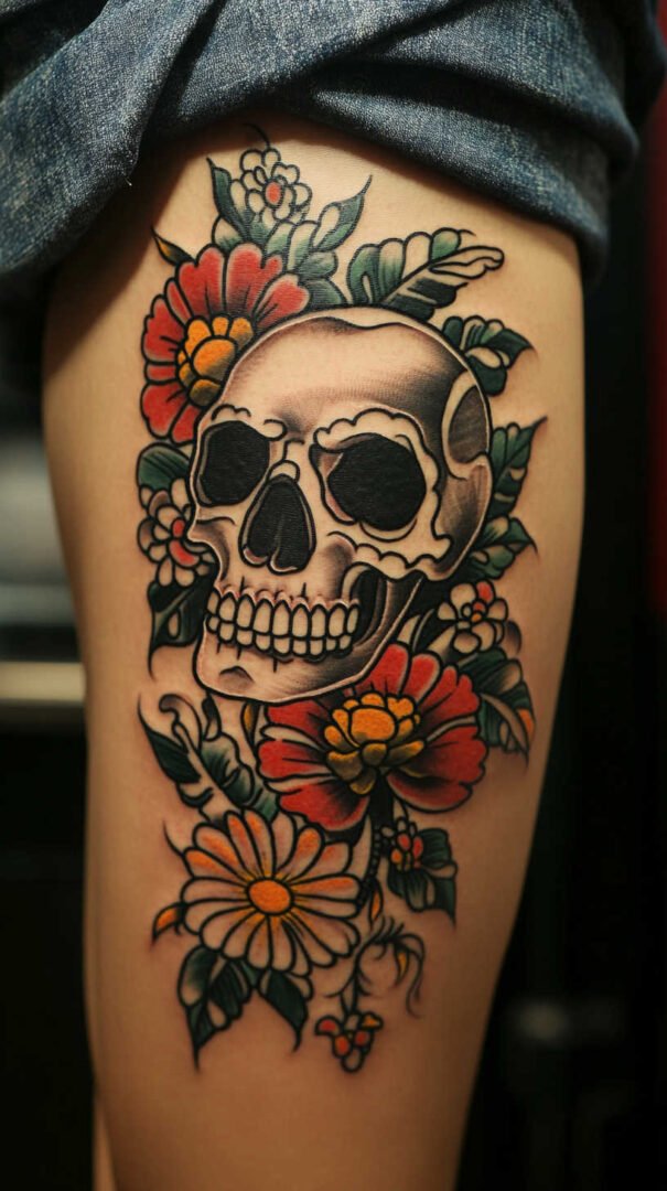 Skulls, though seemingly macabre, are softened in women’s designs by adding roses or bows, turning them into memento mori reminders laced with beauty. These elements highlight the duality of old school tattoos: tough yet tender, bold yet beautiful.