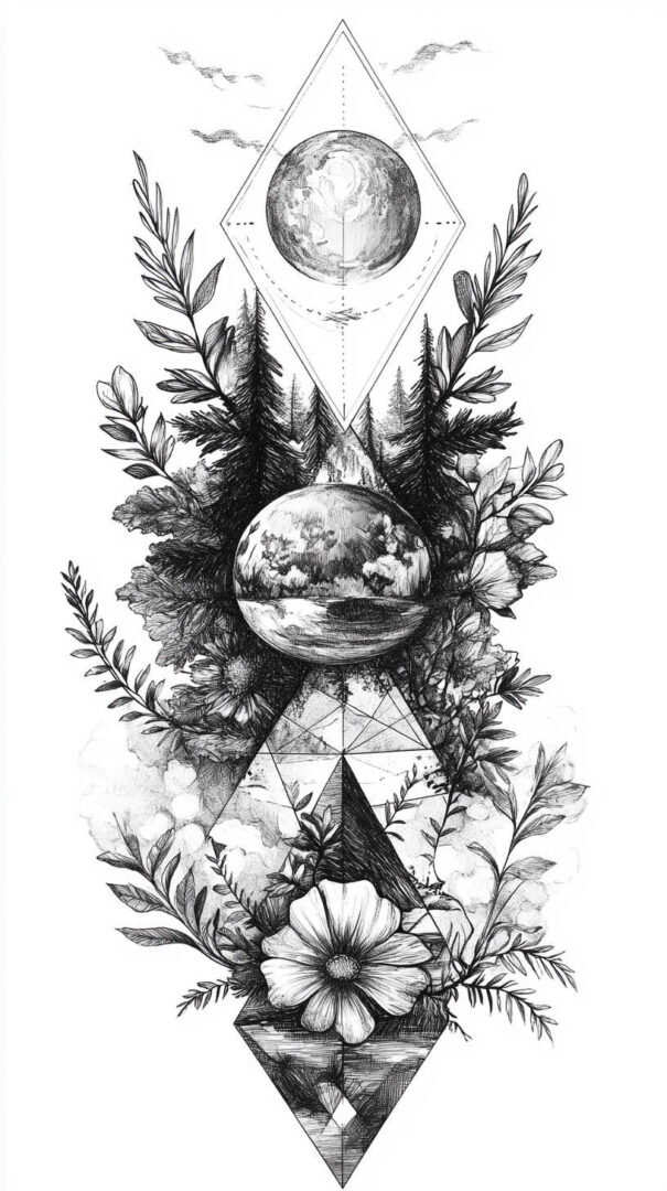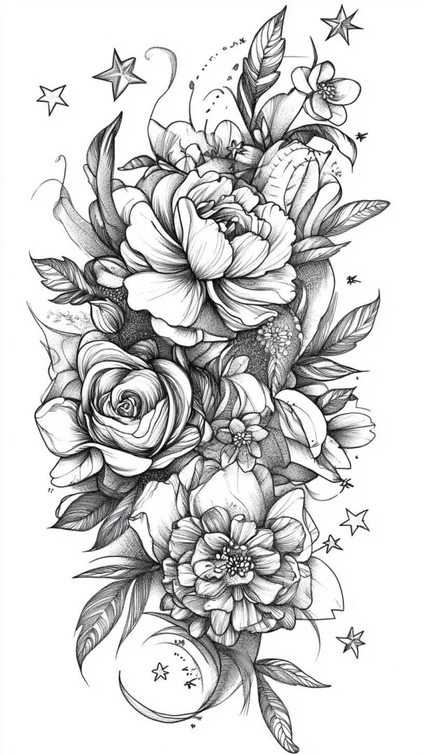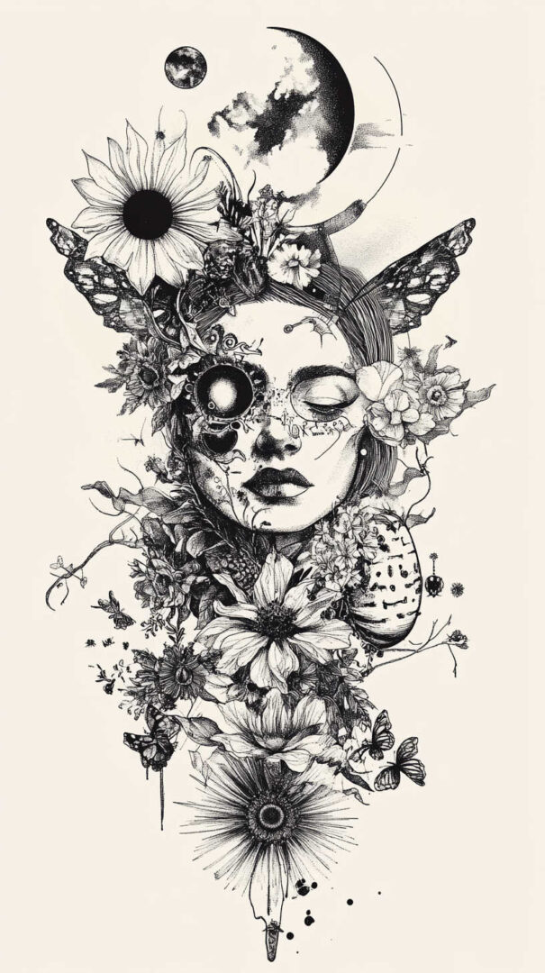 - Floral elements (roses, lotuses) mixed with celestial motifs (moons, stars, constellations).