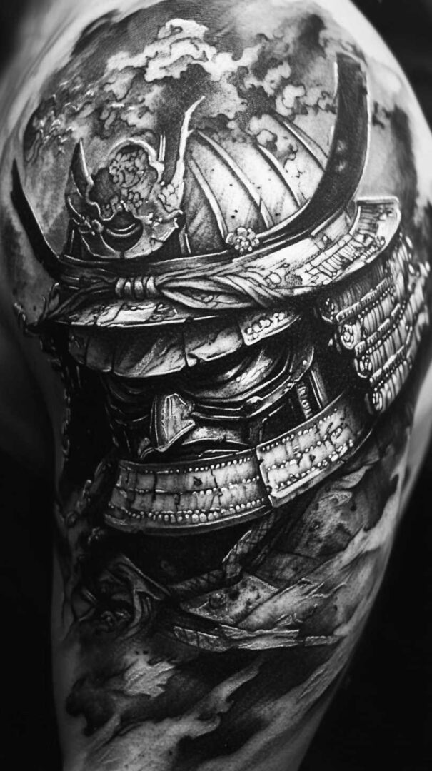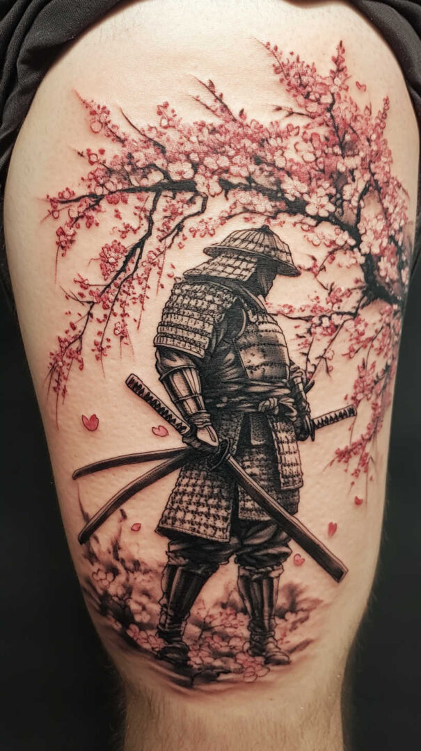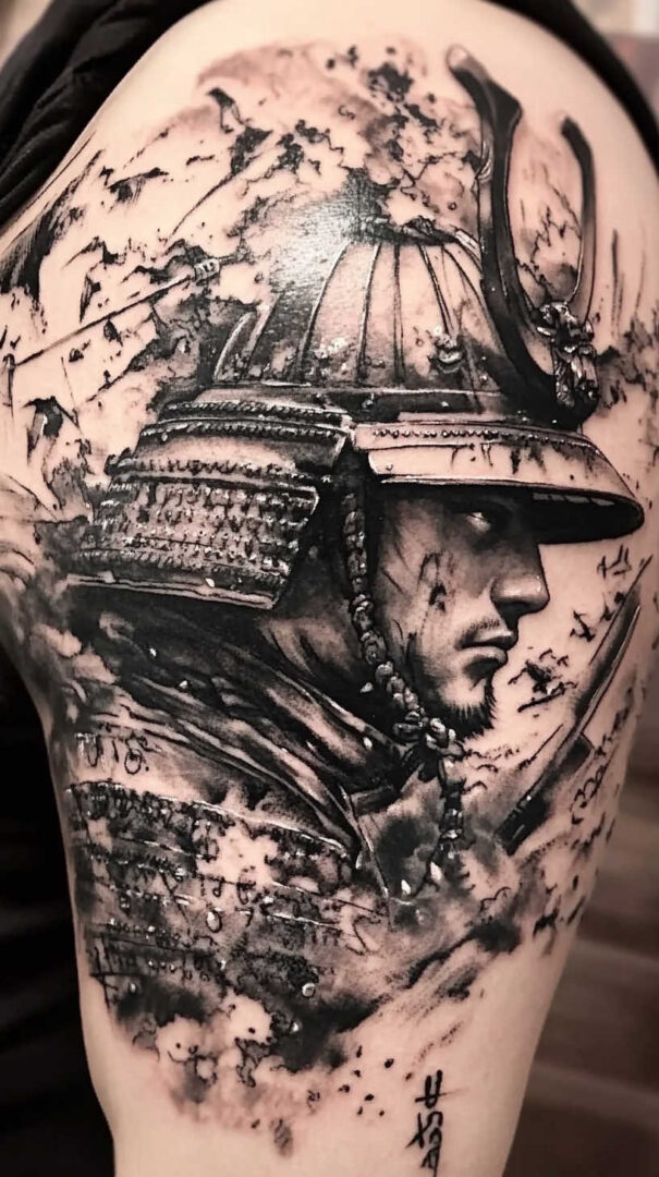 Men choose samurai tattoos to represent inner discipline, resilience in adversity, personal honor, protection of family and values, or the warrior mindset required to face modern challenges. Designs range from realistic portraits to traditional Japanese irezumi-style compositions and symbolic elements like helmets, swords, or cherry blossoms. High-resolution renders emphasize the contrast between cold steel and soft fabric, creating a timeless, commanding presence.