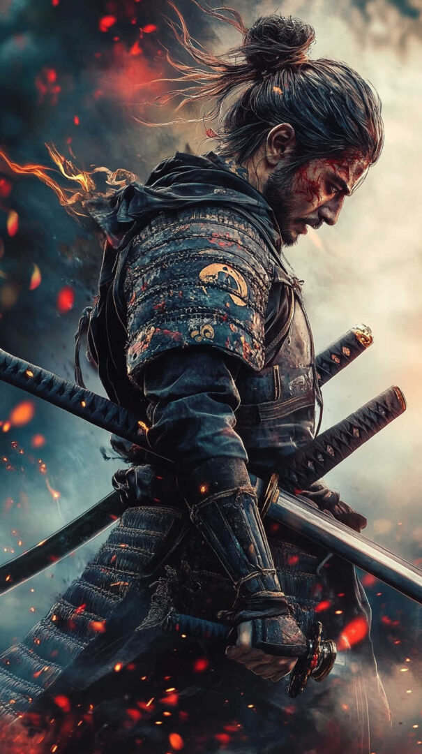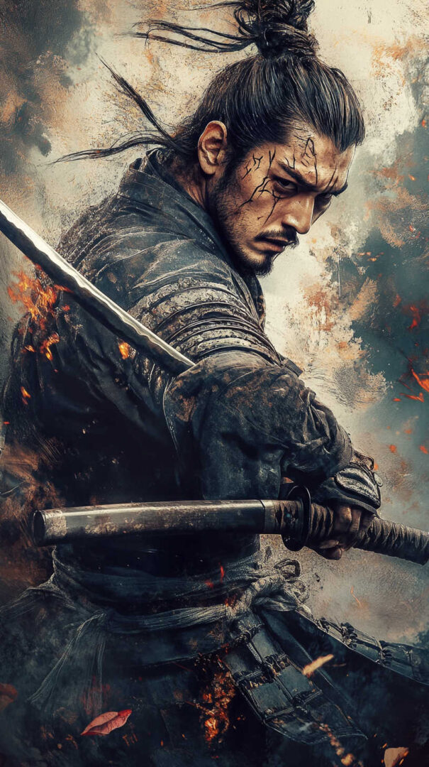 Color choices amplify the samurai’s energy.
