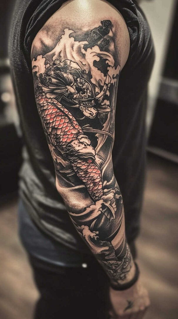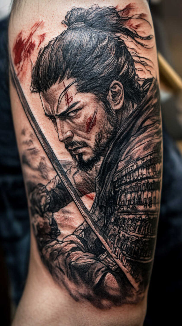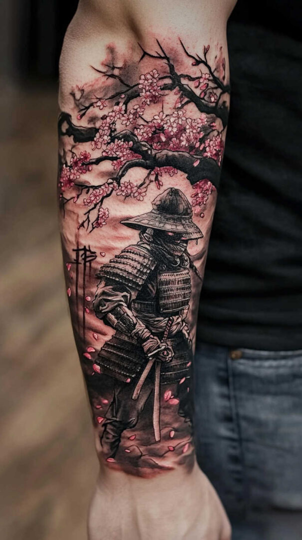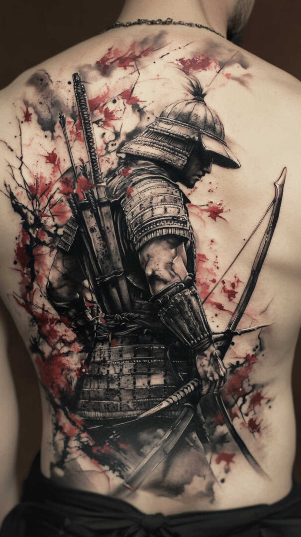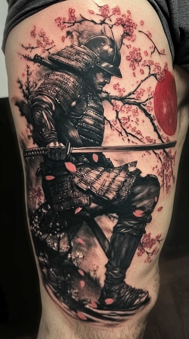 Black-and-grey creates stoic, timeless depth with excellent aging. Selective red (armor lacing or blood), gold (helmet details), or blue (fabric) accents add traditional vibrancy. Traditional irezumi styles use bold reds, blues, and golds for cultural richness.