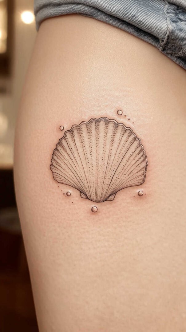 The thigh offers versatility for medium-sized tattoos. A conch shell with surrounding elements can be detailed in HD, flowing with the leg’s curves. Women appreciate this placement for its sensuality and the ability to showcase the tattoo in summer attire.