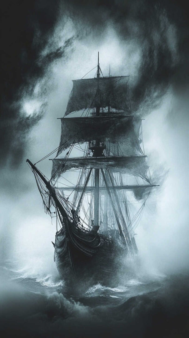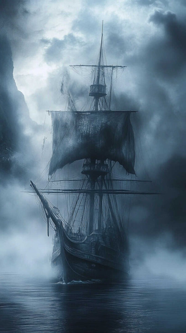 Black sails, skull-and-crossbones flags, cannon fire, and stormy seas create dramatic scenes. Some feature ghost ships emerging from mist or Kraken tentacles wrapping the hull.