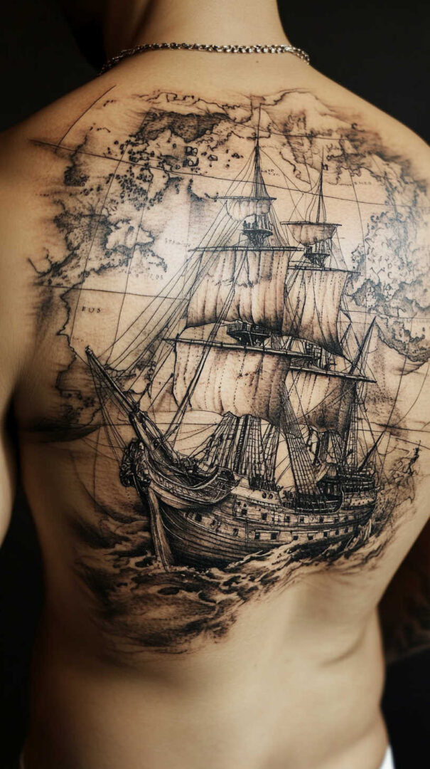 - Chest — Large ship sailing across the pectorals for emotional journey themes.