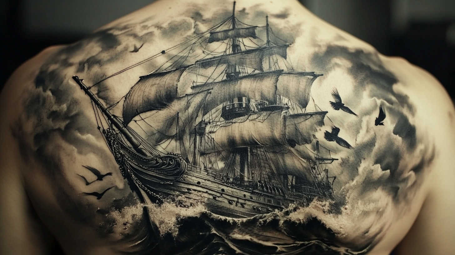 - Chest — Large ship sailing across the pectorals for emotional journey themes.
