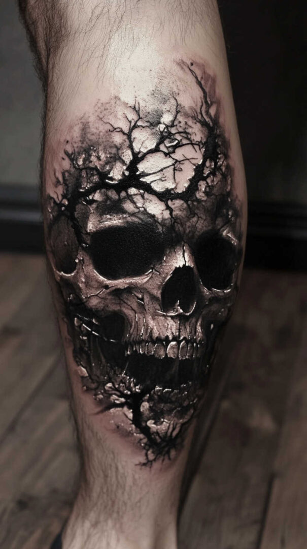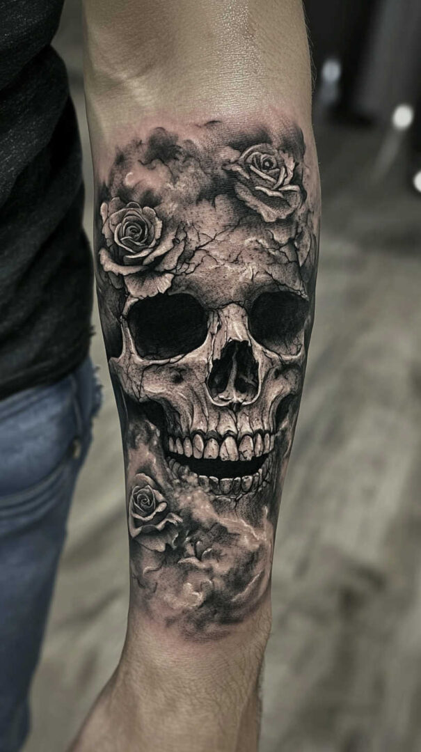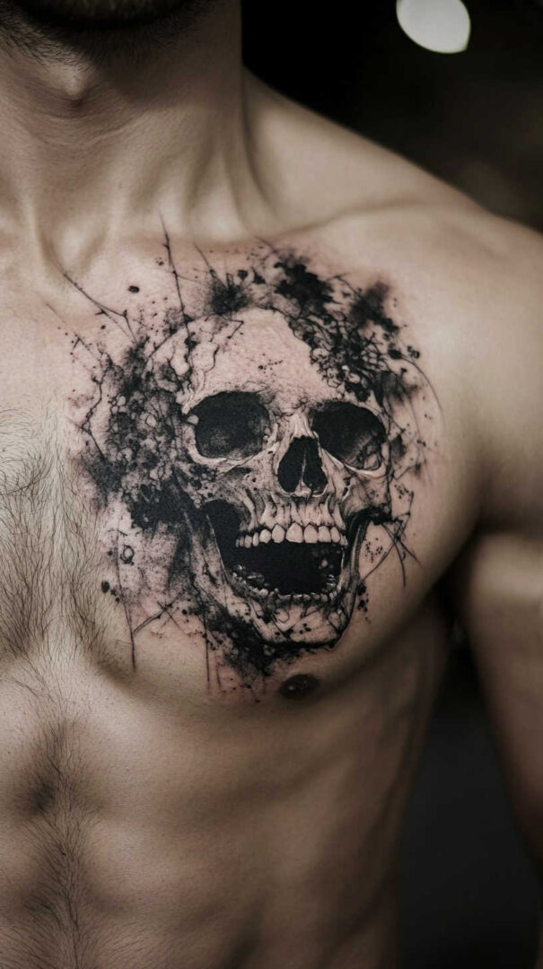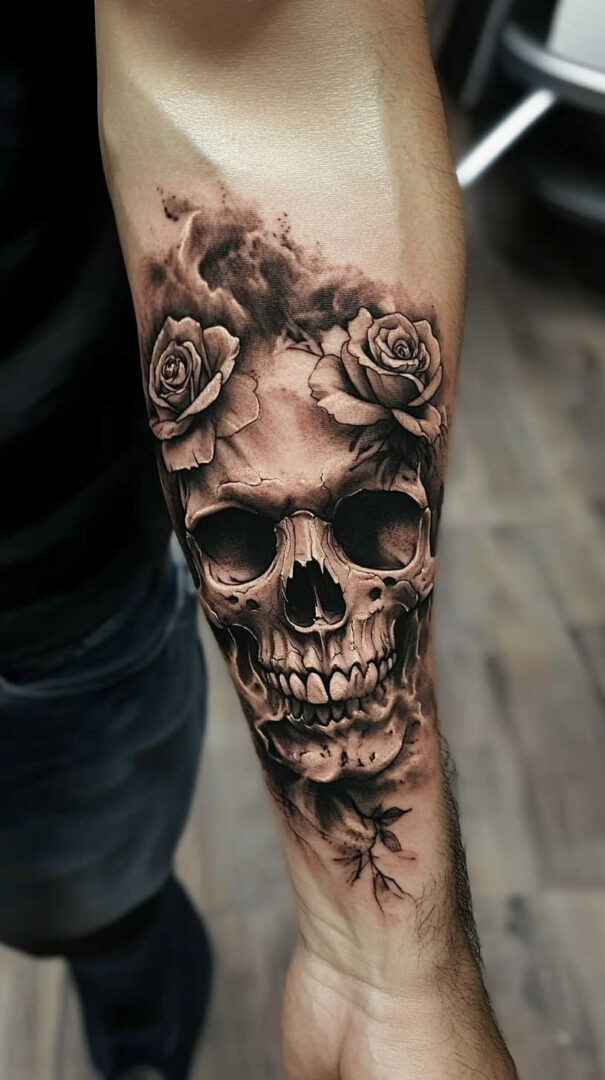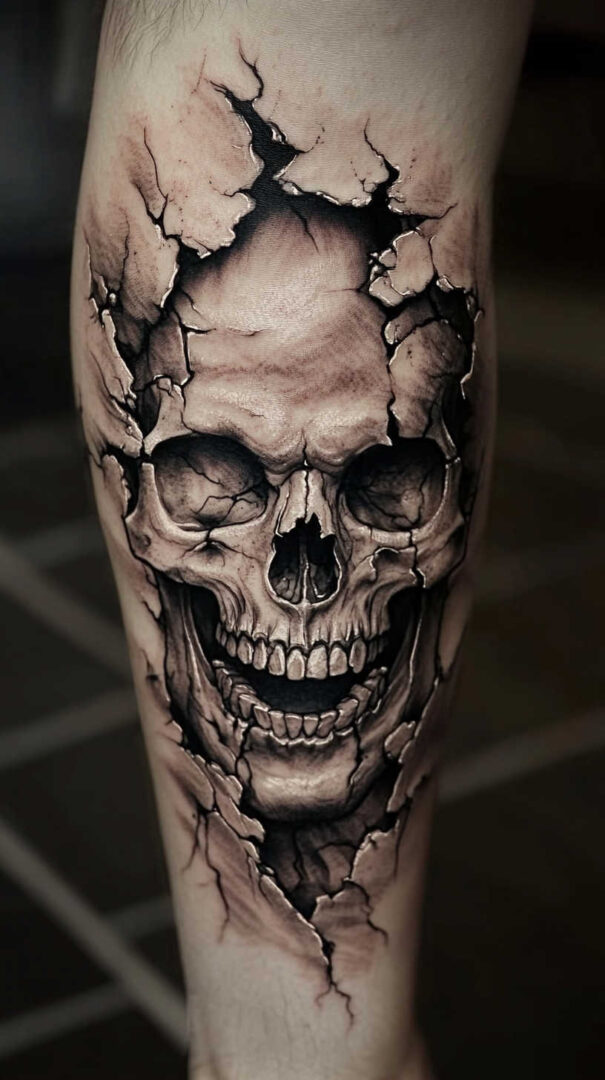 Men choose skull tattoos to represent memento mori (“remember you must die”), inner strength, overcoming fear of death, or a bold statement of living fully. Designs range from hyper-realistic anatomical skulls to stylized traditional, geometric, or symbolic interpretations. High-resolution renders emphasize depth, contrast, and how light and shadow create a haunting yet majestic presence.