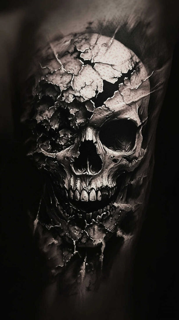 Black-and-grey realism uses masterful gradients to create three-dimensional depth and haunting presence. HD quality preserves every fissure, suture line, and pore-like bone texture for striking realism.