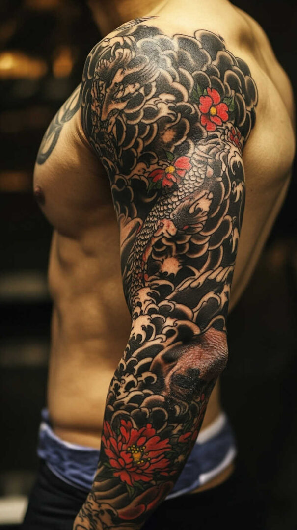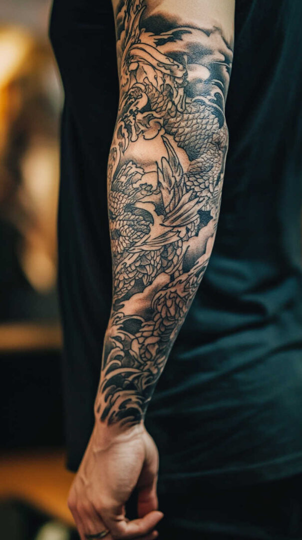 - Dragon (Ryu) — Coiling serpentine dragon from shoulder to wrist, surrounded by waves, clouds, and cherry blossoms.