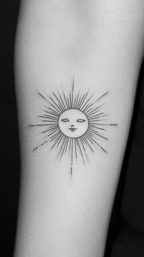 Minimalist sun tattoos are perfect for women who prefer subtlety with impact. These often feature a simple circle with radiating lines, rendered in fine black ink for a clean, elegant look. In 4K HD, the precision allows for micro-details like subtle dotwork or geometric patterns within the sun’s core. This style suits first-time tattoo enthusiasts, offering a timeless design that symbolizes purity and simplicity. Placed delicately, it whispers of quiet strength.