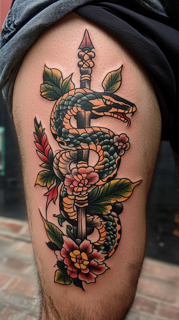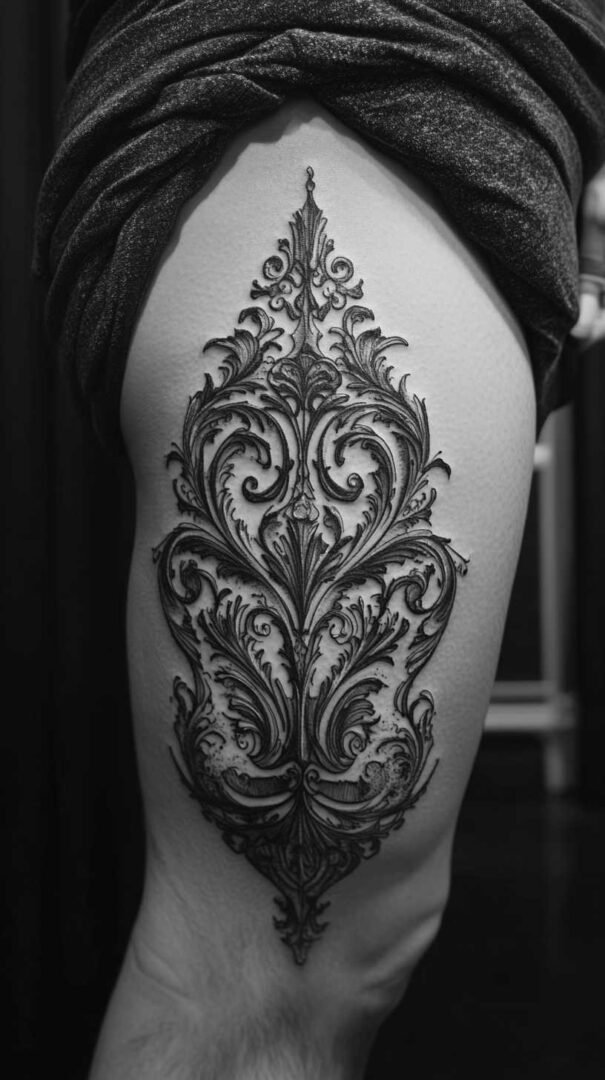 Effective thigh tattoos require strong vertical or wrapping flow: