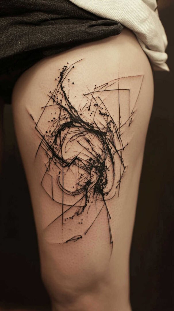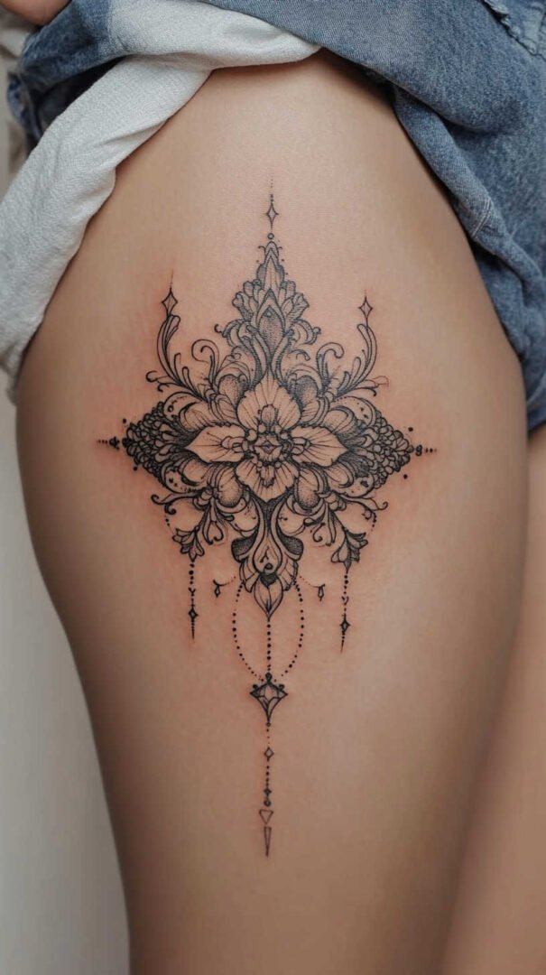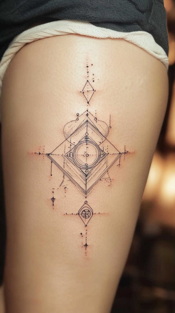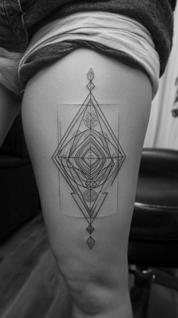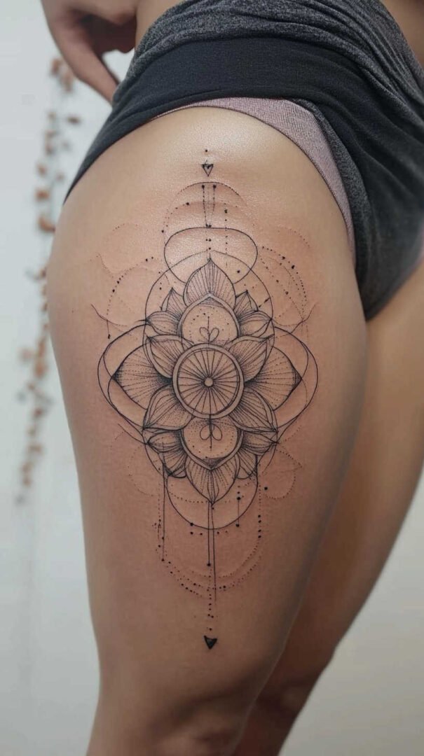 A central mandala on the outer thigh can expand outward with layered rings of dots, lines, and shapes, incorporating subtle floral accents for femininity. Geometric thigh tattoos might feature sacred geometry like the Flower of Life or interlocking triangles, symbolizing harmony and interconnectedness.