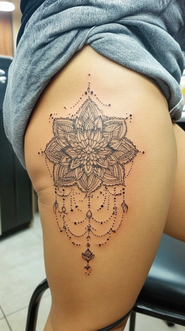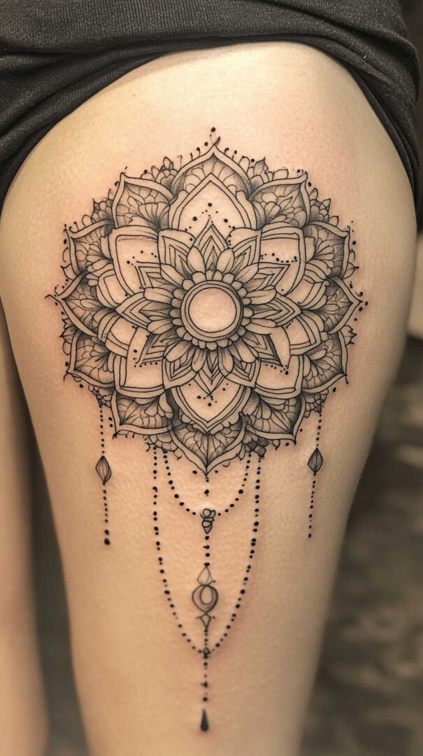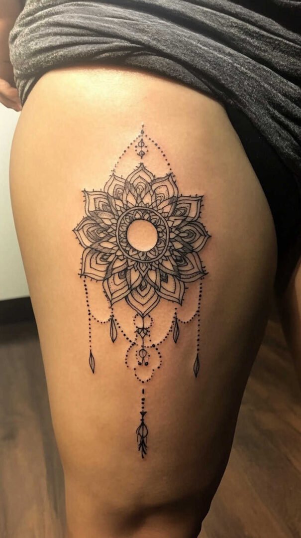 For those drawn to structure and introspection, mandala thigh tattoos offer profound appeal. Mandalas represent wholeness, balance, and the universe, often tied to spiritual practices like meditation. Intricate geometric patterns within a mandala create mesmerizing symmetry that draws the eye inward.