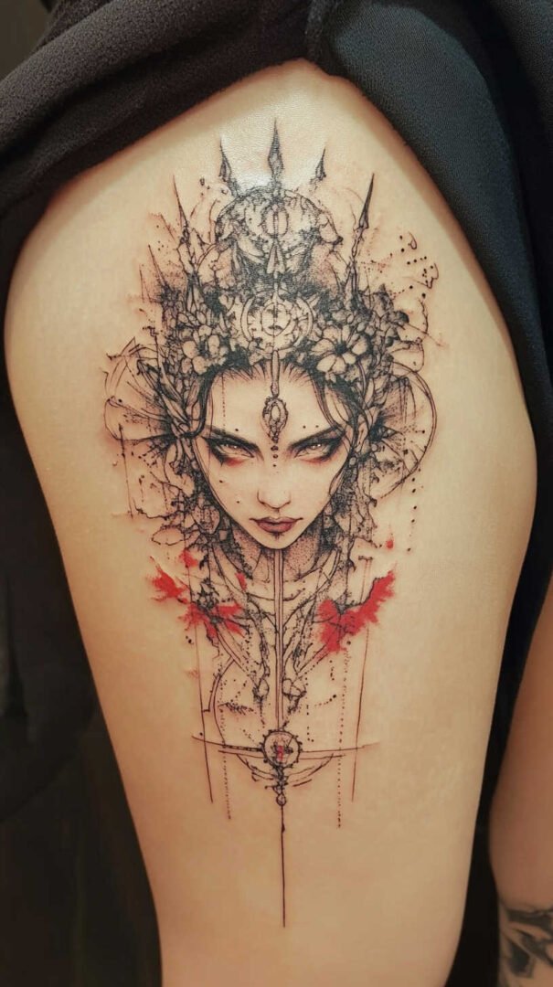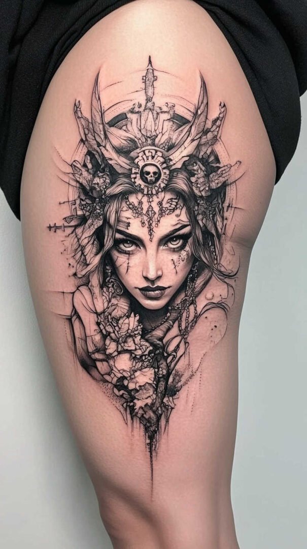 Thigh tattoos empower women by accentuating strength, grace, and individuality. They transform the body into a living gallery, where designs can wrap around curves, extend from hip to knee, or focus on a single striking focal point.