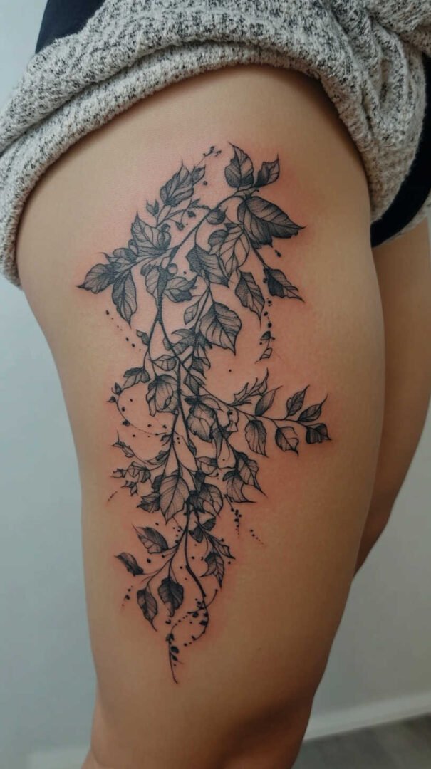 Roses frequently appear, representing passion, love, and resilience. A sprawling rose thigh tattoo might cascade down the outer thigh, with petals unfolding in intricate detail and thorns adding edge. Lilies evoke purity and rebirth, often rendered in soft gradients for a ethereal effect. Orchids convey exotic elegance and strength, ideal for wrap-around compositions that follow the leg’s curve.