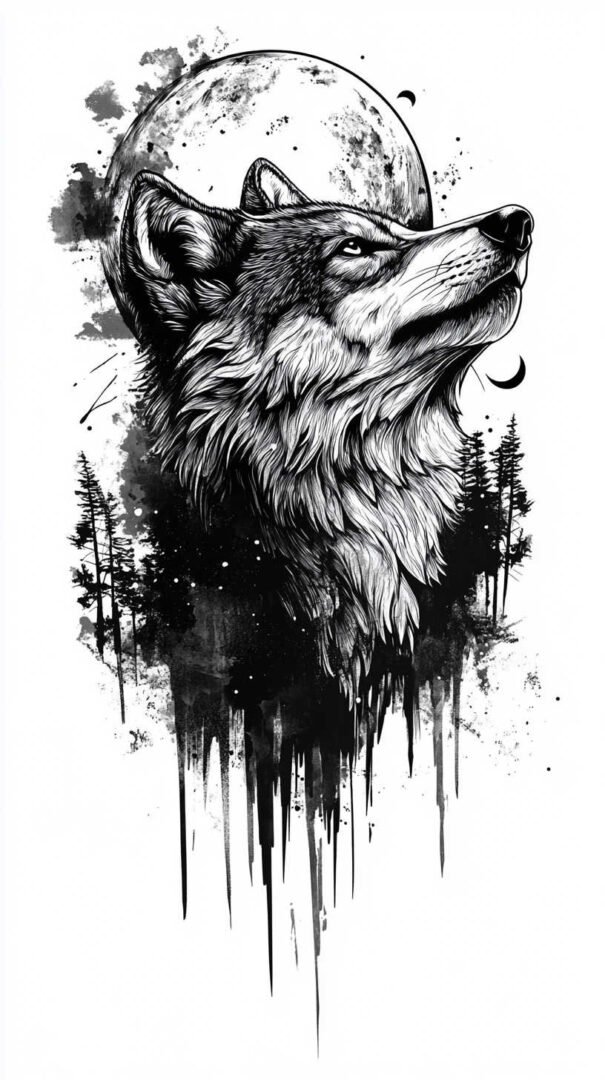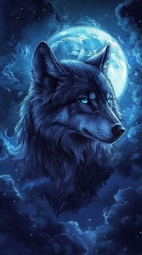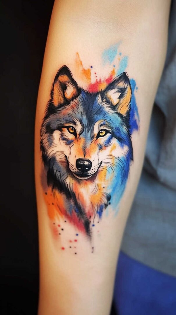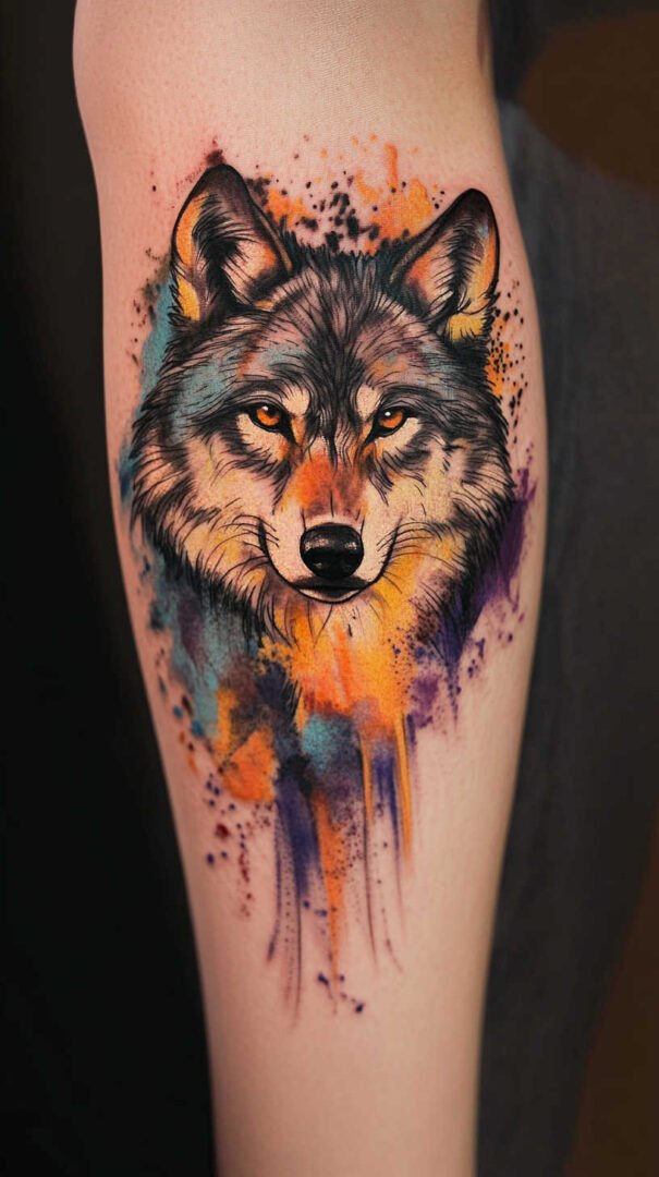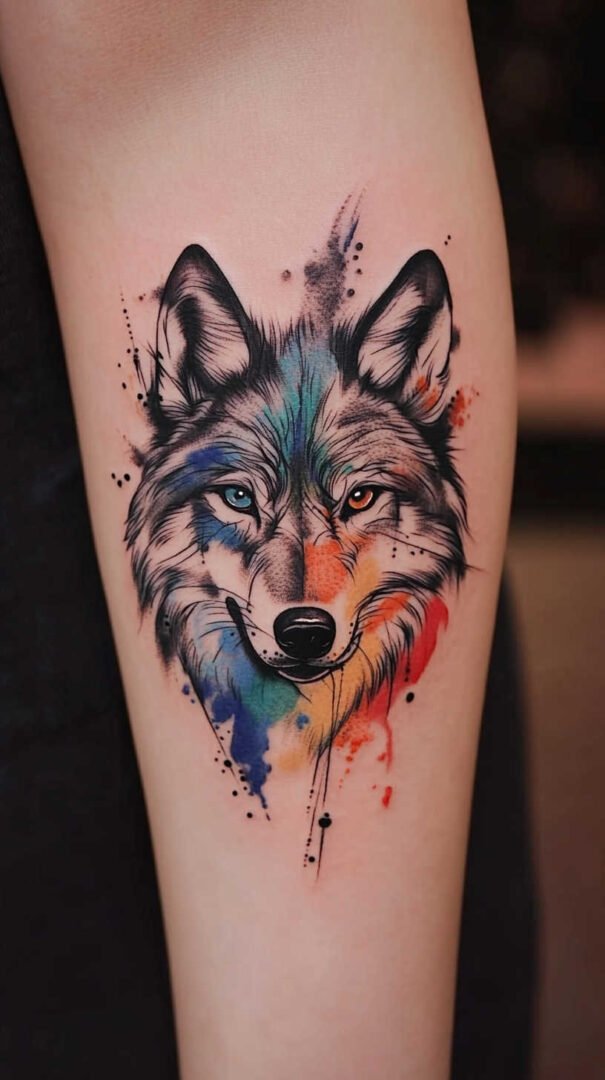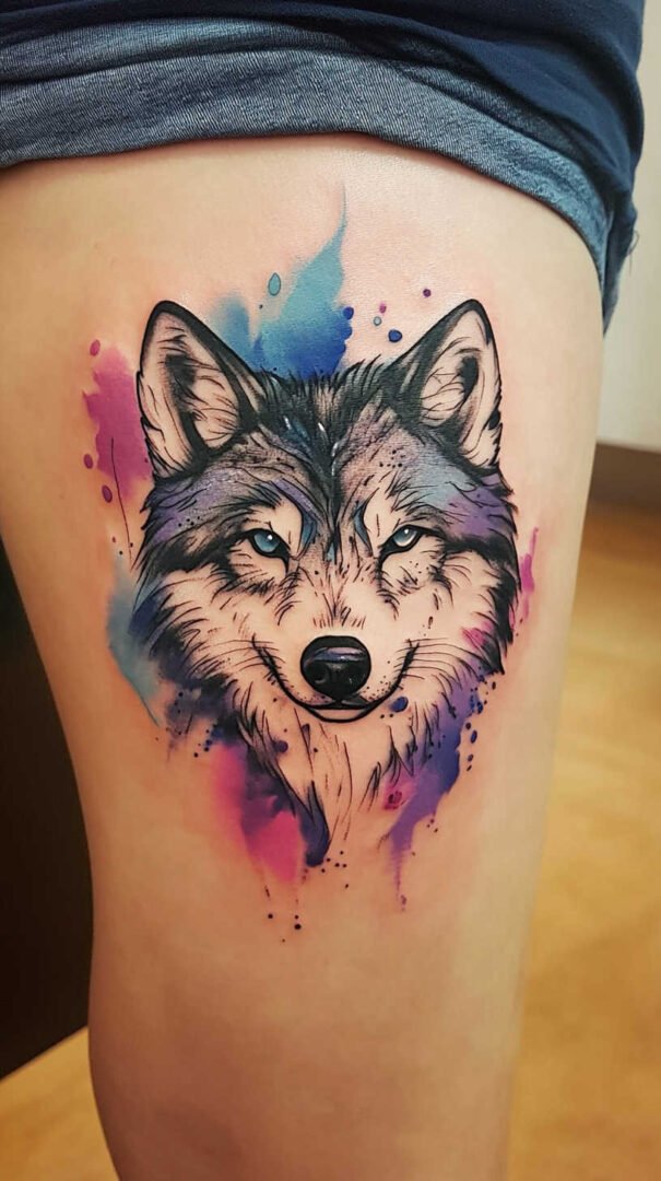 Watercolor effects bring softness and vibrancy. Blended hues—blues, purples, grays—create an ethereal, dreamlike quality, softening the wolf’s fierceness with artistic fluidity. Flowers, moons, or stars integrated into the fur add feminine touches, representing growth, femininity, or celestial guidance.