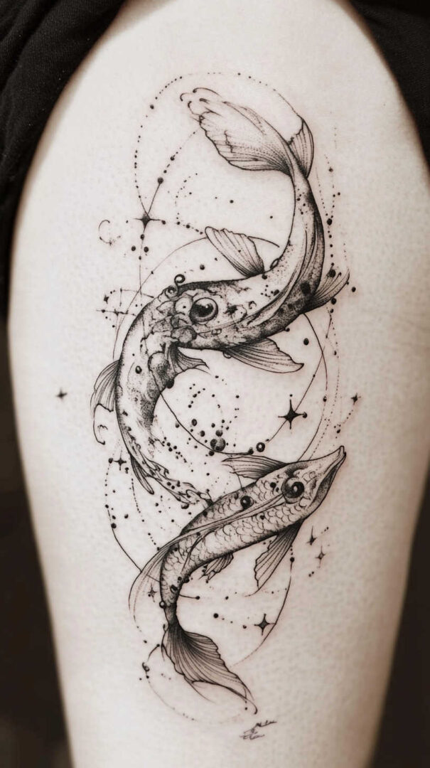 Black-and-grey creates timeless, celestial depth with excellent aging. Selective metallic gold or silver stars, or sign-specific colors (fiery red for Aries/Leo, deep blue for Scorpio/Pisces) add vibrancy. Minimalist styles often use pure black line work with negative space stars.